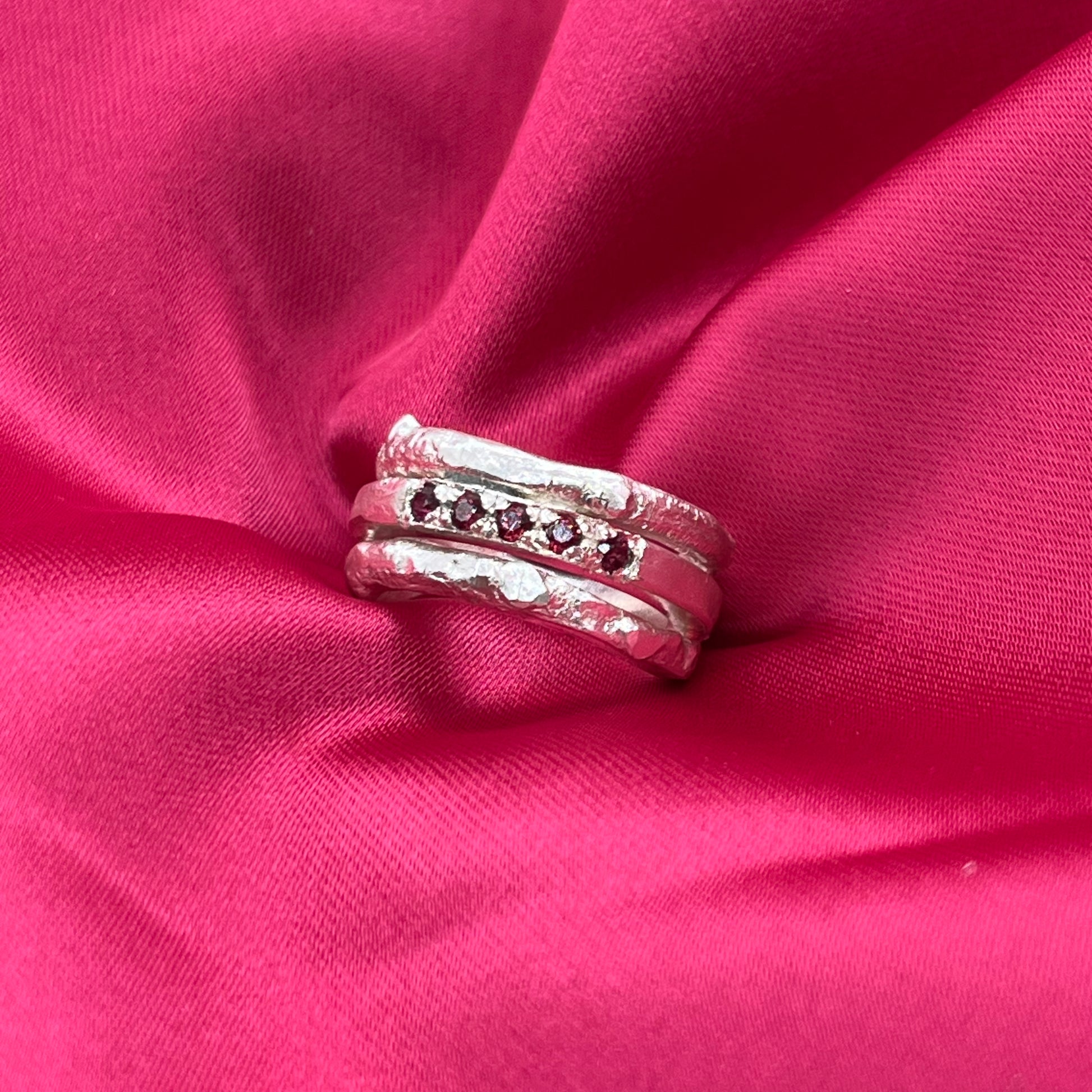 El Anillo King es una pieza única y exclusiva, diseñada desde cero con granalla de plata. A simple vista, parece ser tres anillos, pero por su parte trasera está unido por una sola banda, brindándole una estructura robusta y fluida. La banda central y frontal del anillo destaca por 5 granates engastados con buril, que le dan un toque elegante y sofisticado. Las otras dos bandas cuentan con textura orgánica, aportando movimiento y un acabado natural.