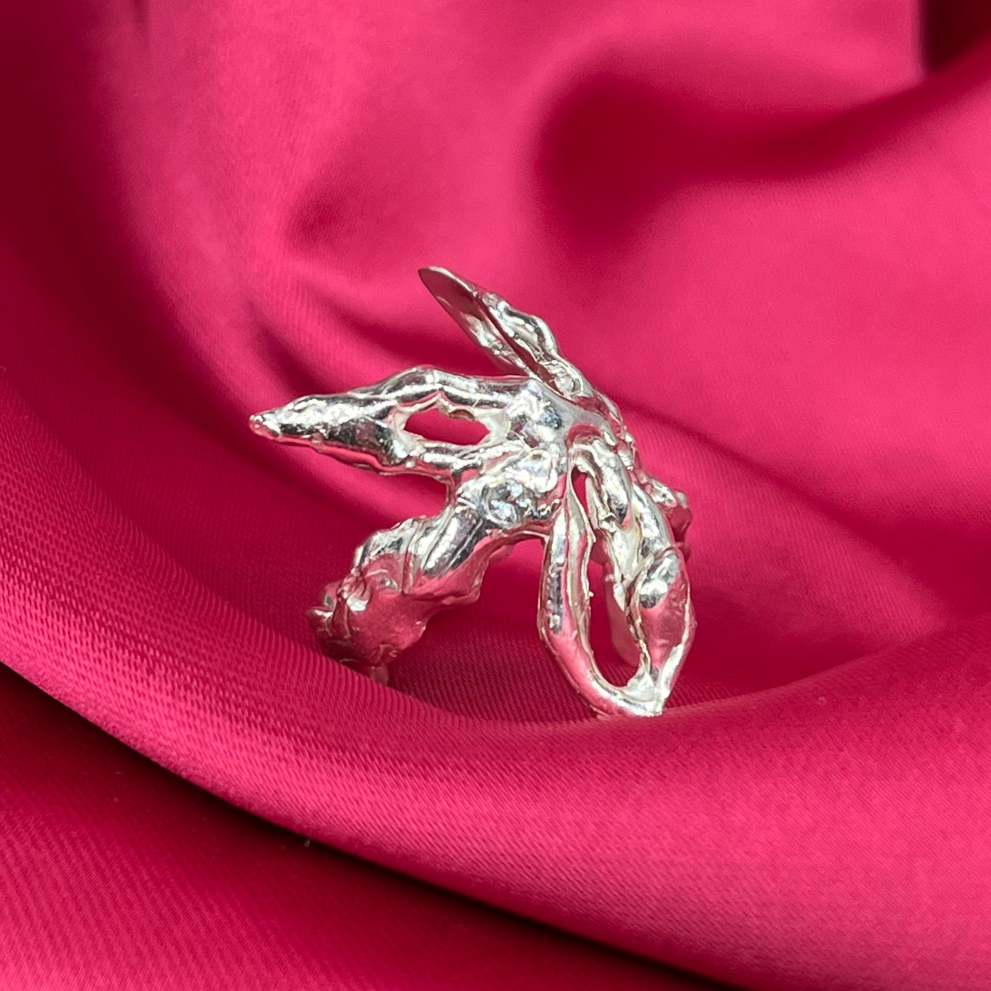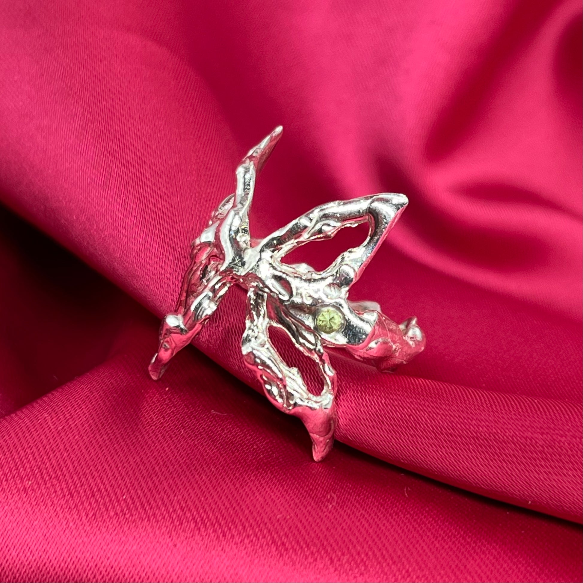 El anillo mariposa es una joya que no pasa desapercibida, tanto para quien lo lleva como para quienes lo observan. Este anillo rodea la parte frontal del dedo con una mariposa elegante, acompañada de dos piedras laterales de 2mm engastadas. Aunque abarca casi toda la falange del dedo, sigue siendo cómodo y perfecto para el uso diario.