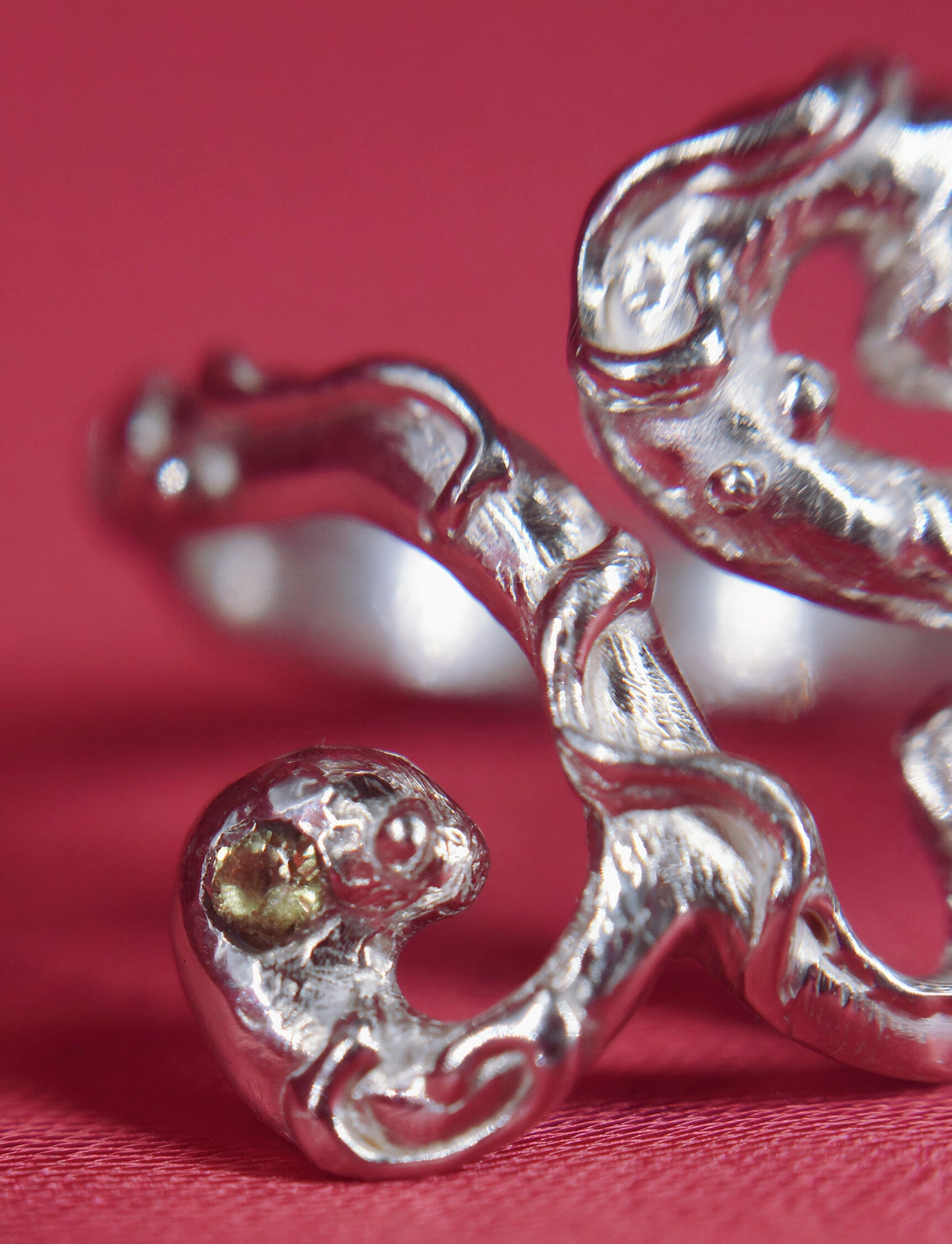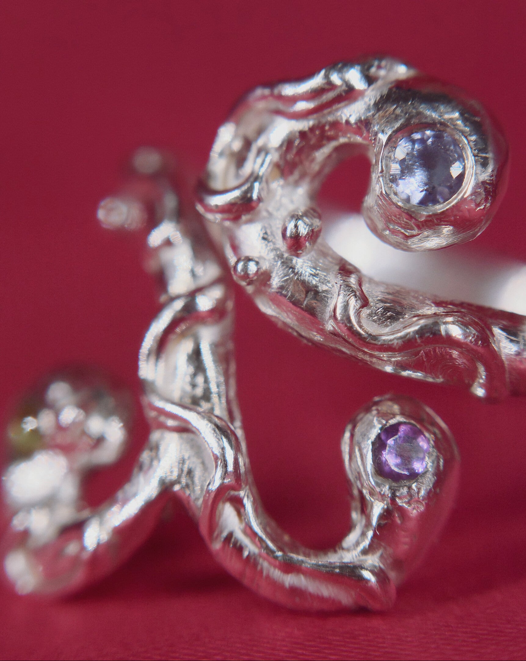 El 777 nace del misterio profundo. Su forma tentacular evoca aquello que habita en las zonas más ocultas del mar: fuerza silenciosa, movimiento instintivo, sabidurÃa antigua. Cada una de sus tres piedras —tanzanita, amatista y peridoto— marca un extremo, como faros que iluminan distintos rincones de la intuición.