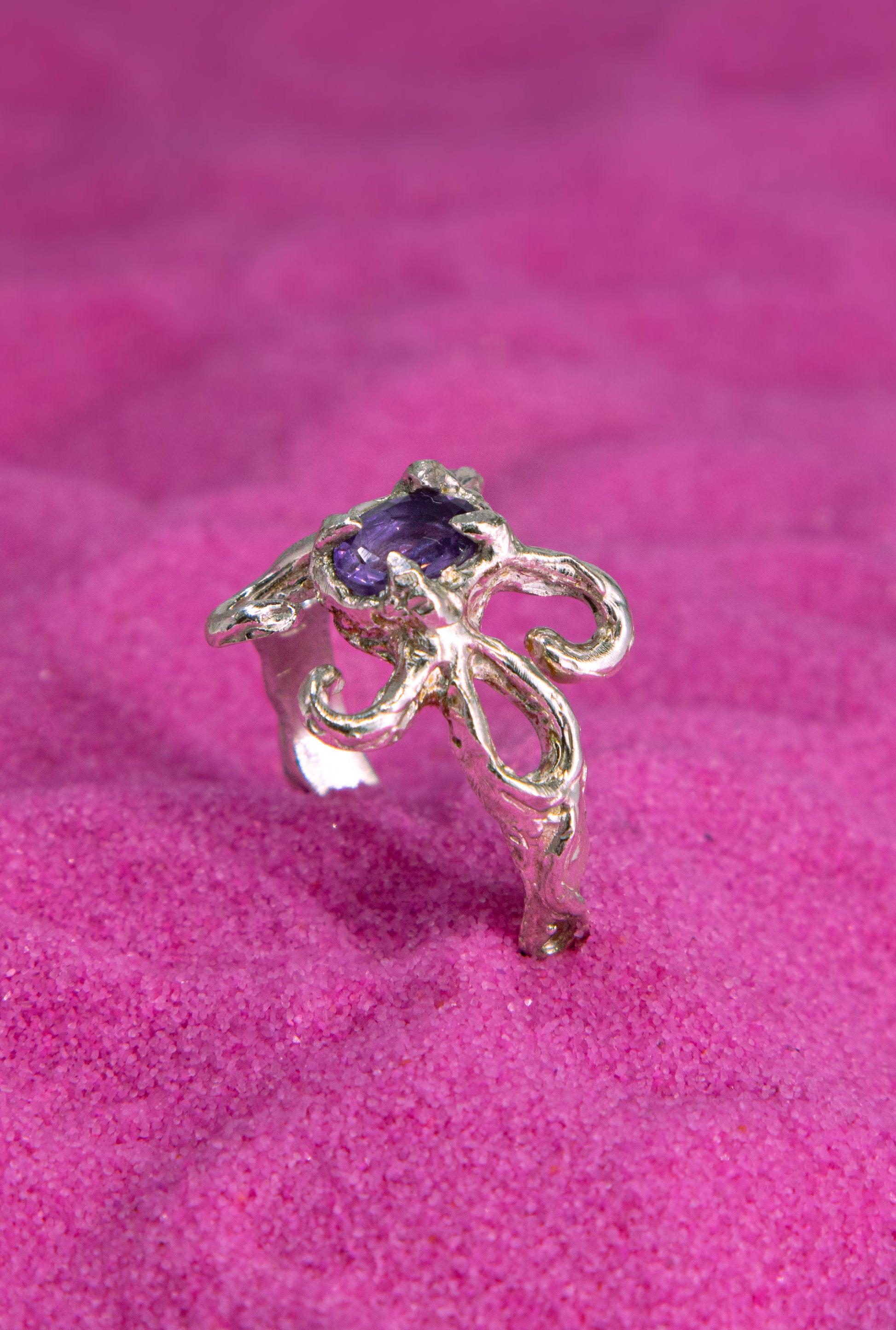 Este anillo tiene la apariencia de una criatura sutil, casi insecto, casi espíritu. En su centro lleva una piedra de 0,8 cm —amatista u ónix, a elección— engastada con 4 grifas, que parece dar vida a un ser que se despliega sobre tu mano.
