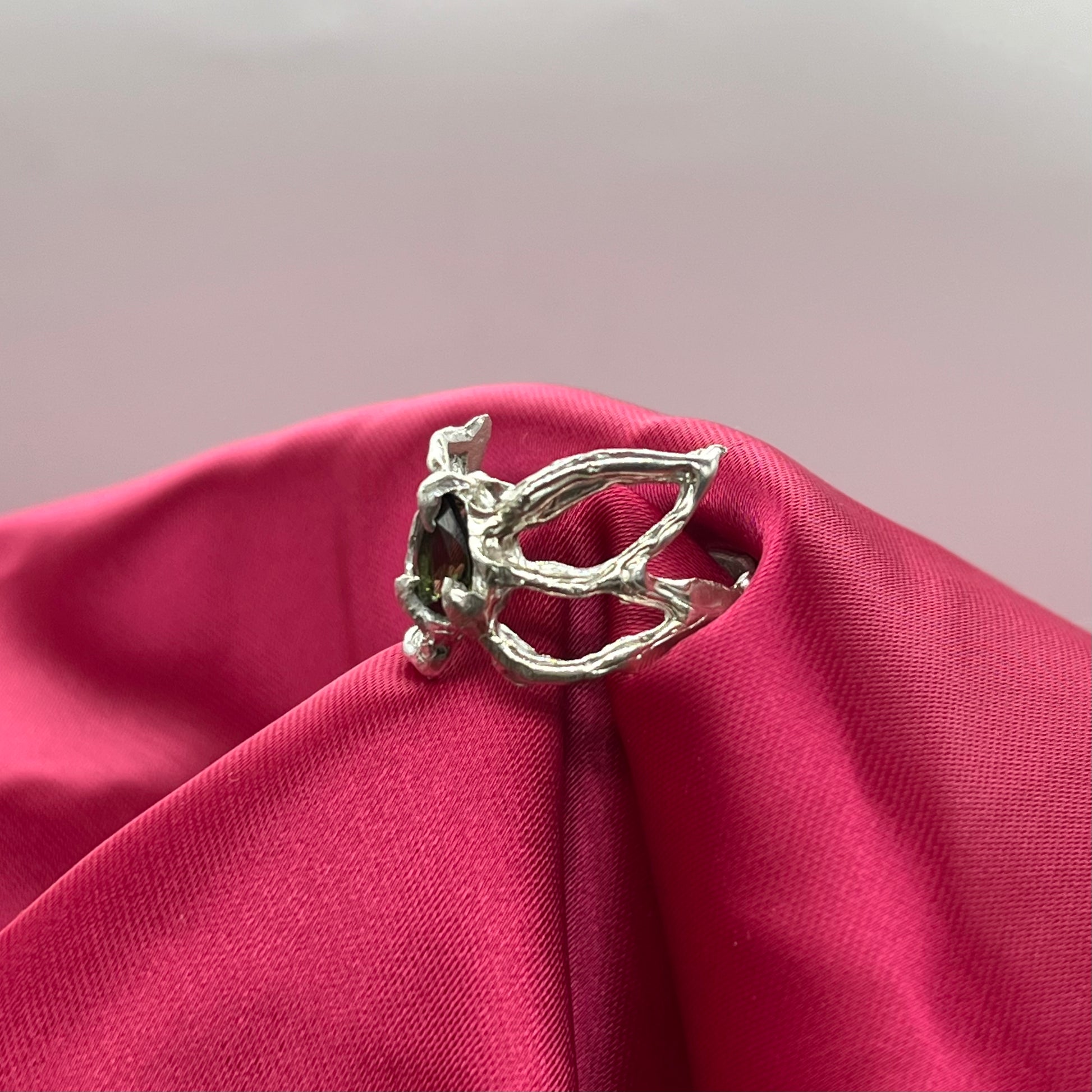 Este delicado anillo en plata 980 está inspirado en la forma de una tiara, perfecta para un hada que quiera llevar una corona llena de gracia. En el centro, se destaca una hermosa turmalina verde en forma de gota, que añade un toque de color y sofisticación a la pieza.