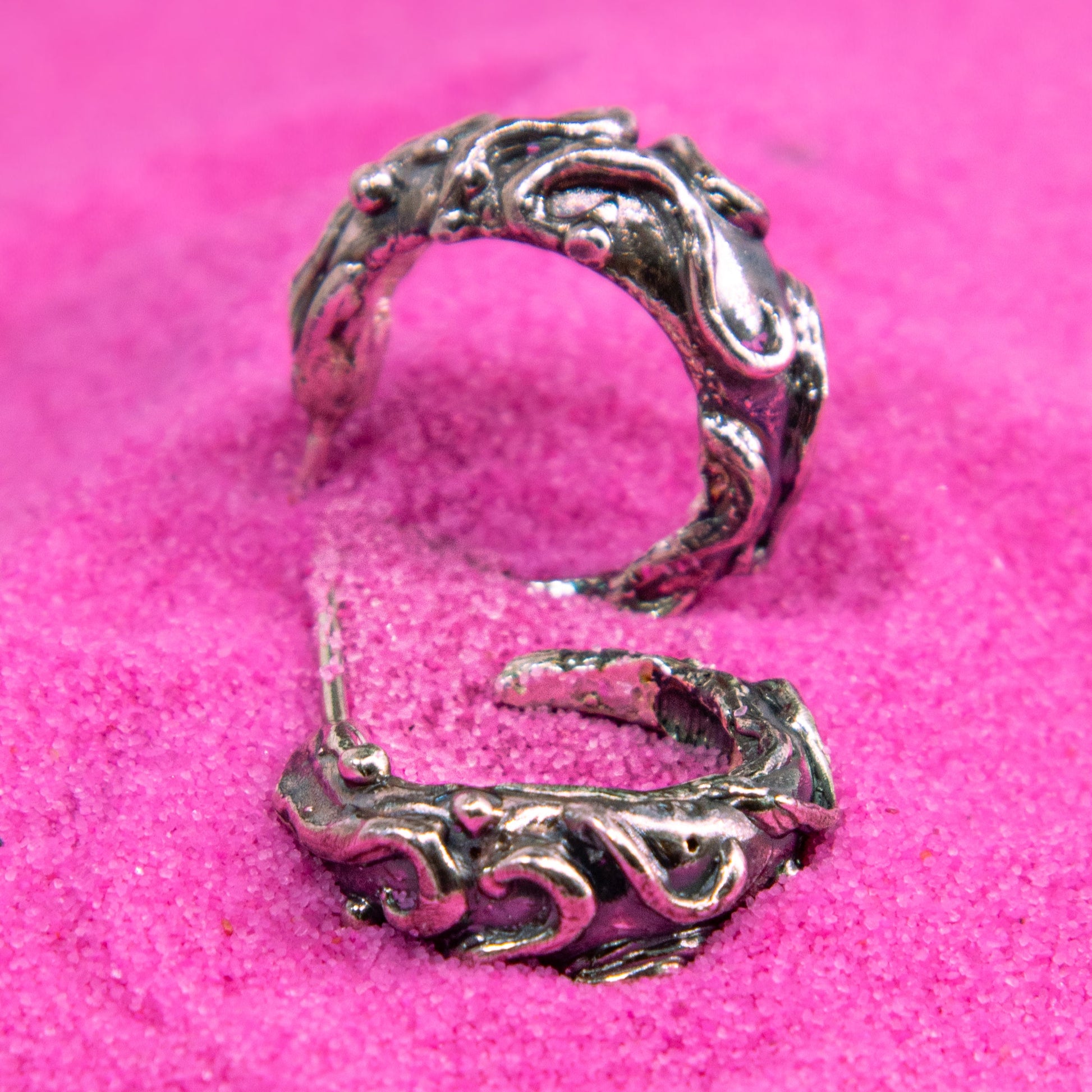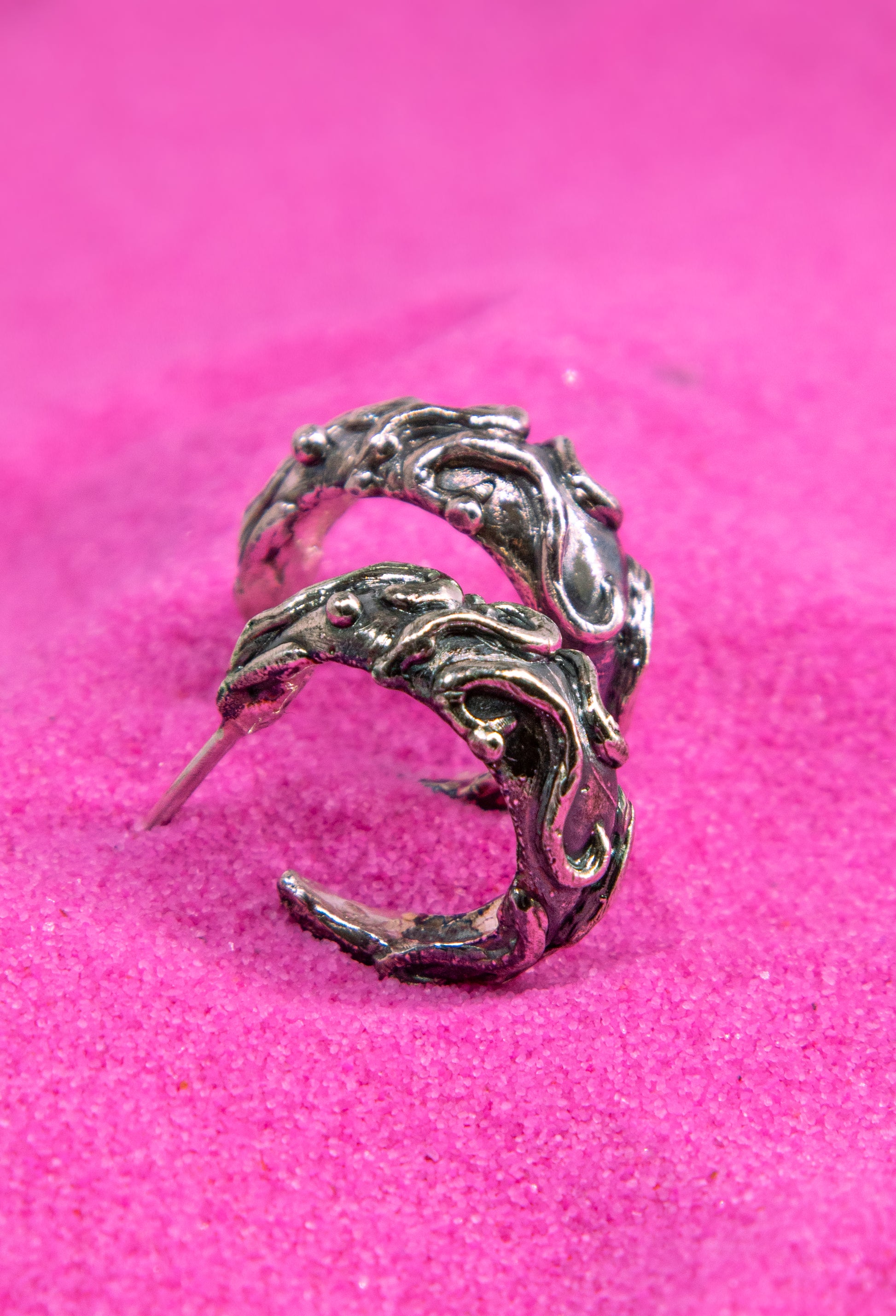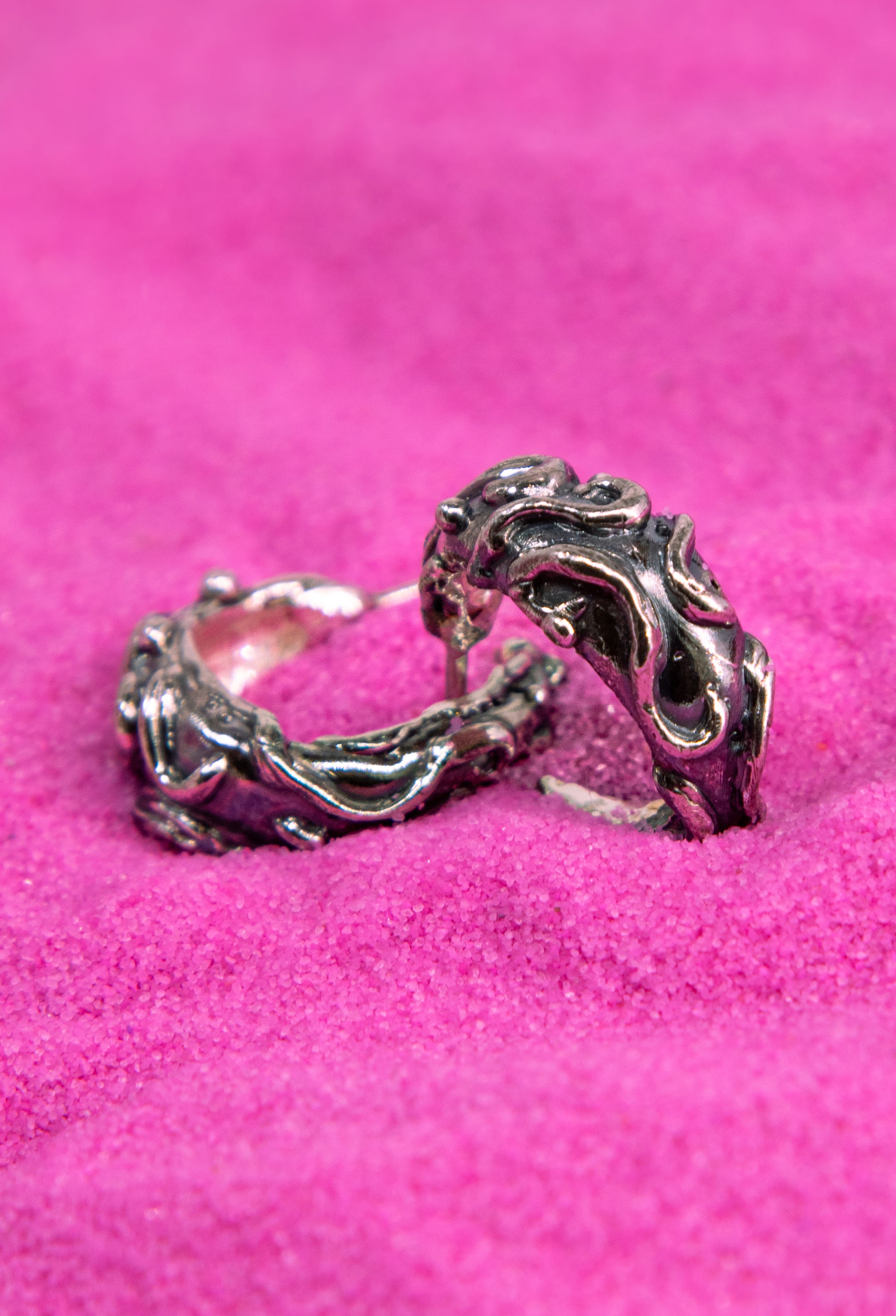 Estas argollas de plata están inspiradas en el movimiento fluido de la naturaleza, en las raíces que penetran la tierra y se entrelazan para dar vida y fuerza. Sus ornamentos curvos reflejan ese fluir constante y la conexión profunda con la tierra, combinando lo orgánico con un toque etéreo.