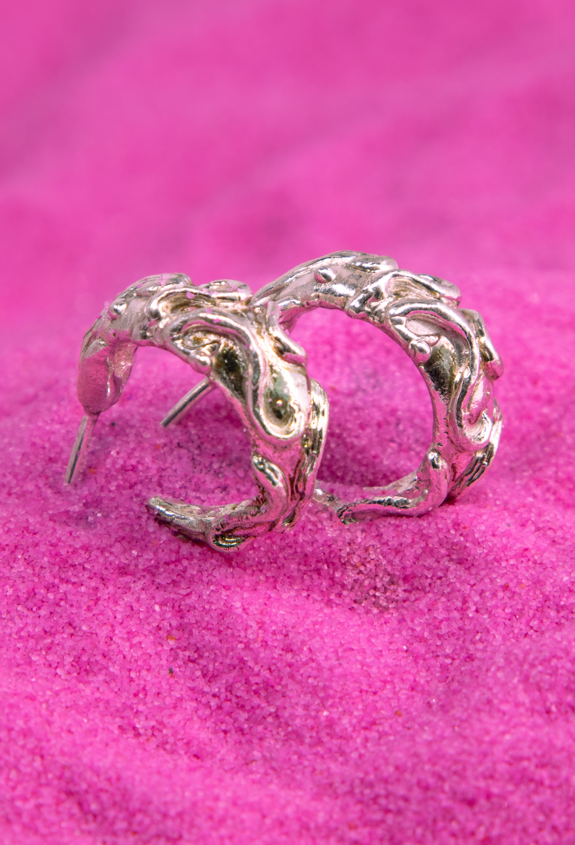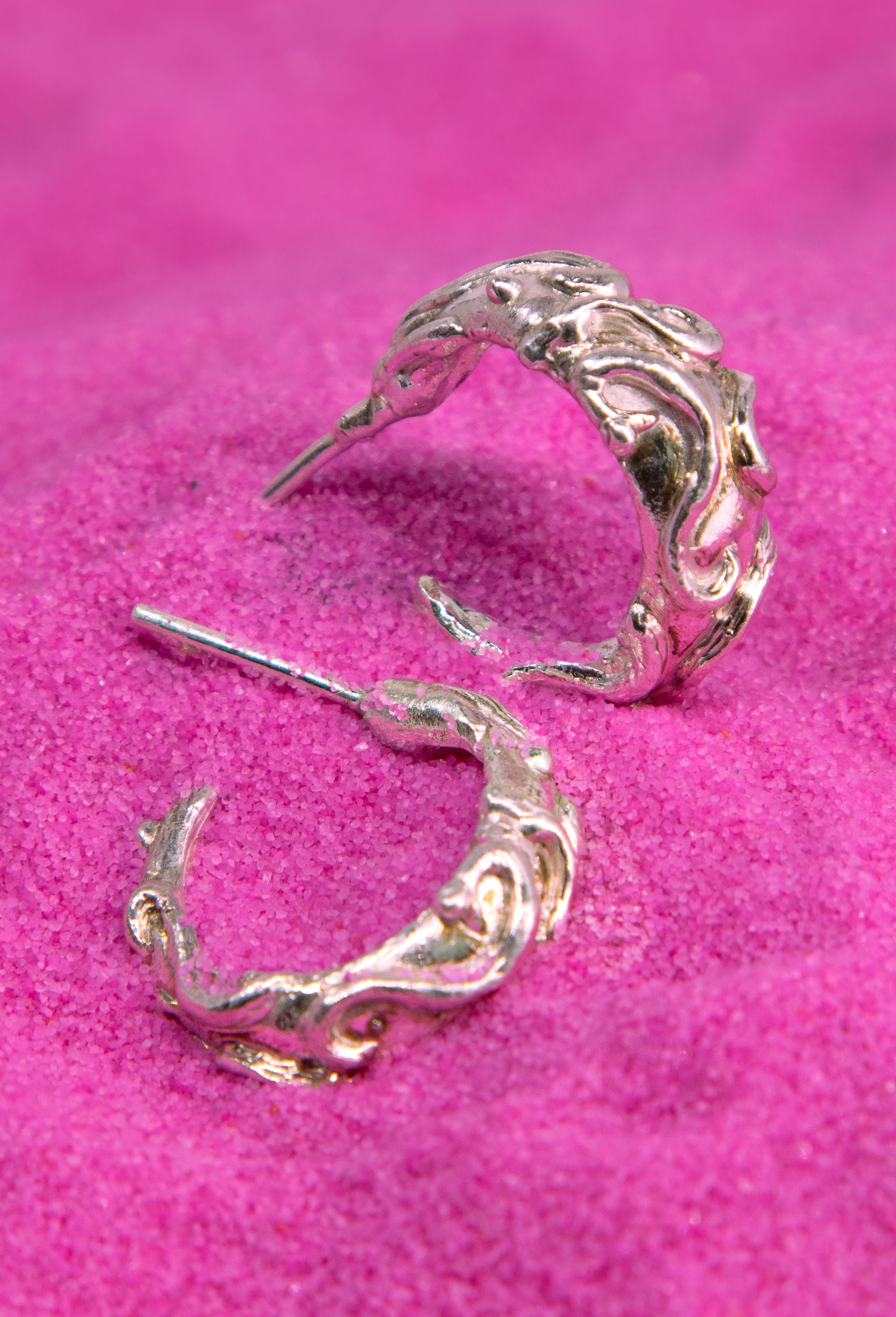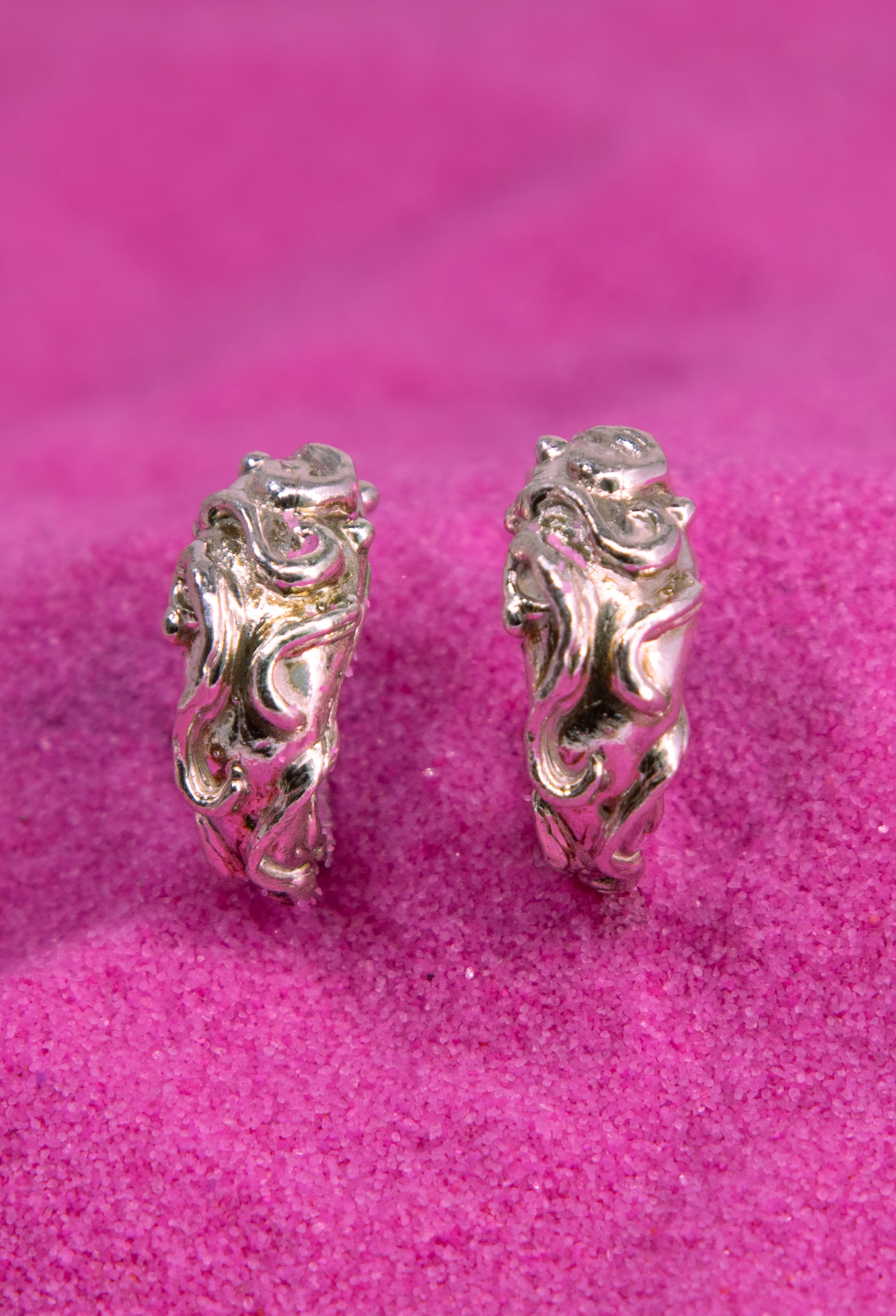 Estas argollas de plata están inspiradas en el movimiento fluido de la naturaleza, en las raíces que penetran la tierra y se entrelazan para dar vida y fuerza. Sus ornamentos curvos evocan ese fluir constante y la conexión profunda con lo natural.
