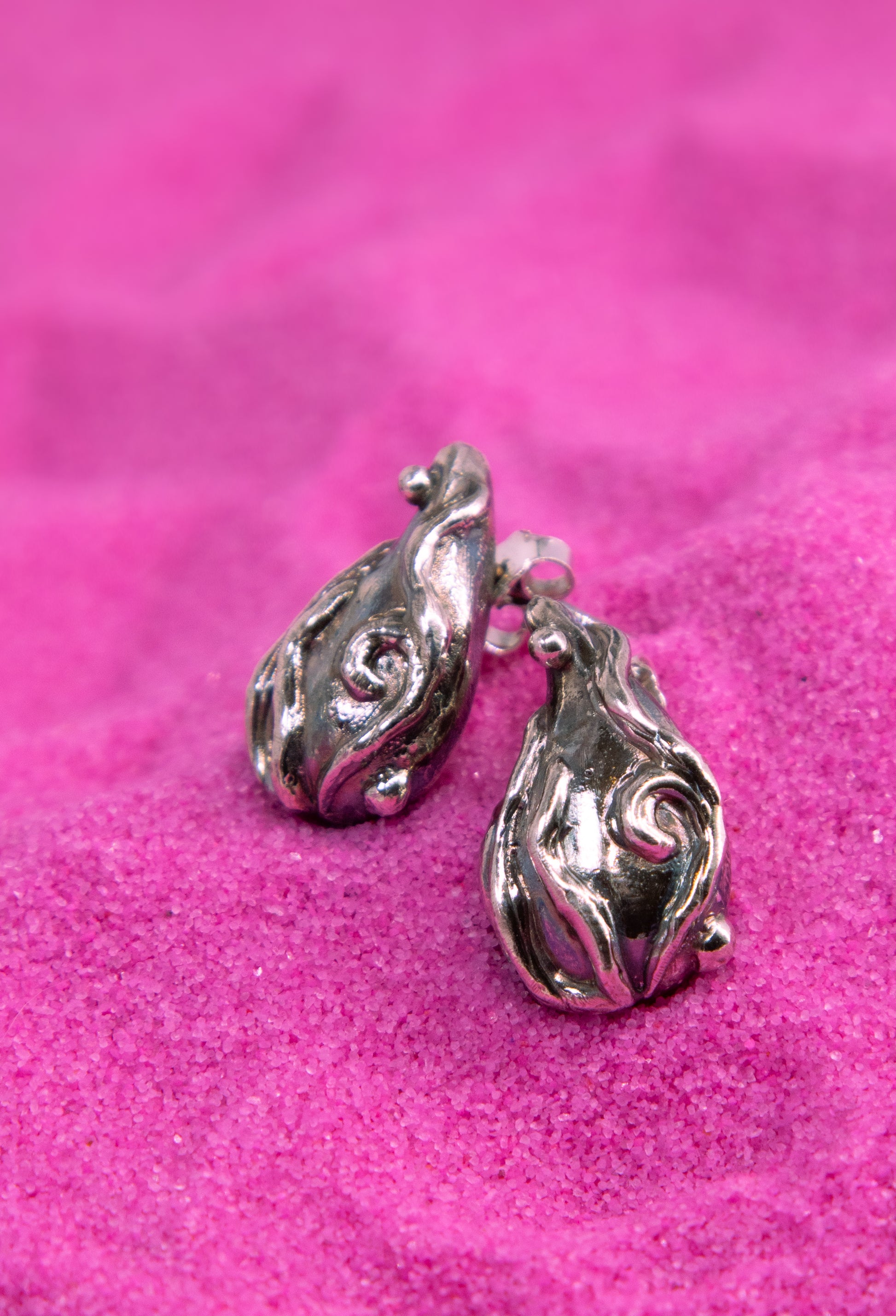 Estos aros tienen forma de gota, inspirados en el agua pura que alivia cualquier dolor y renueva el espíritu. Su superficie está adornada con delicados ornamentos que representan las hierbas y plantas que crecen alrededor de esta agua sagrada, conectándote con la naturaleza y su poder sanador.