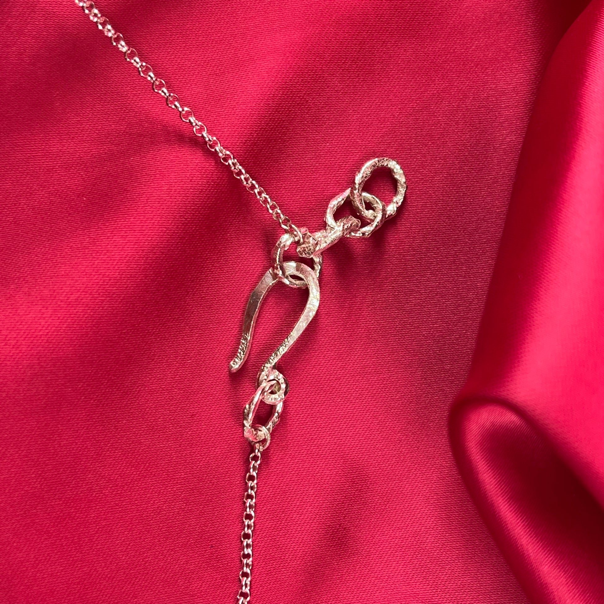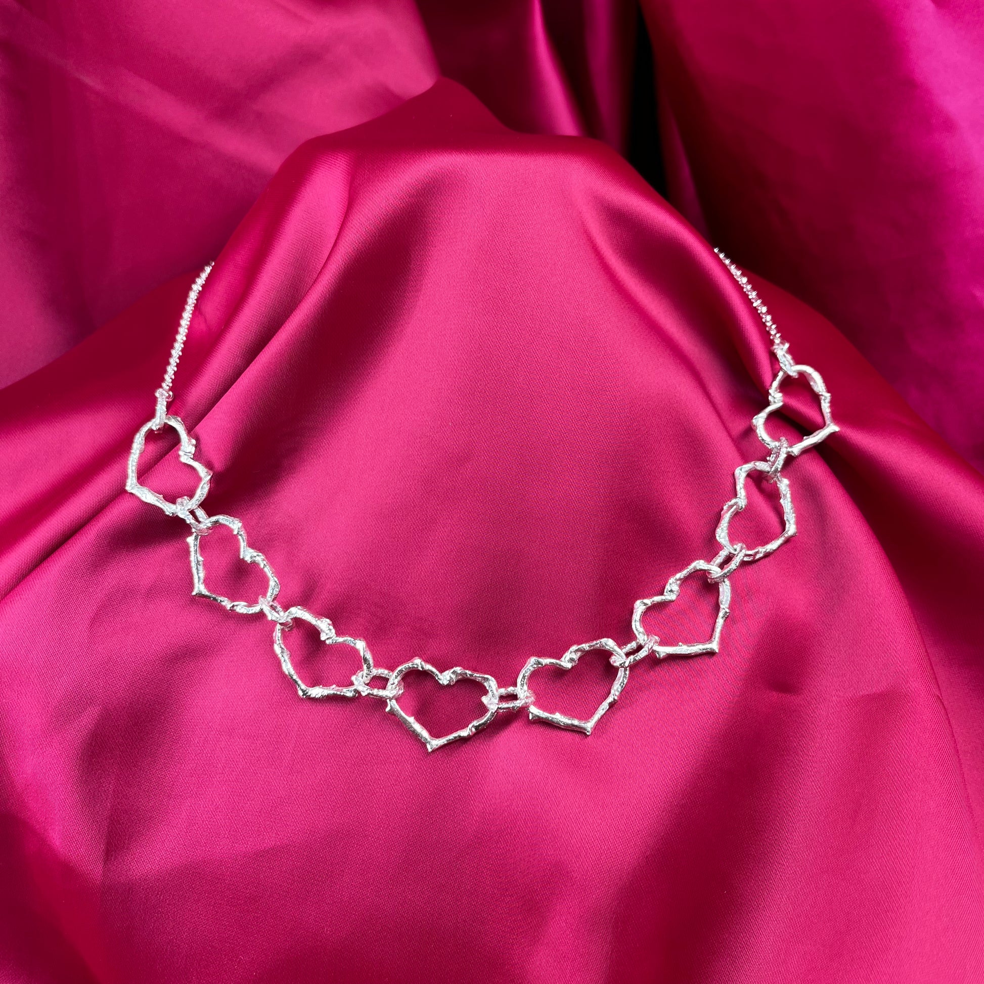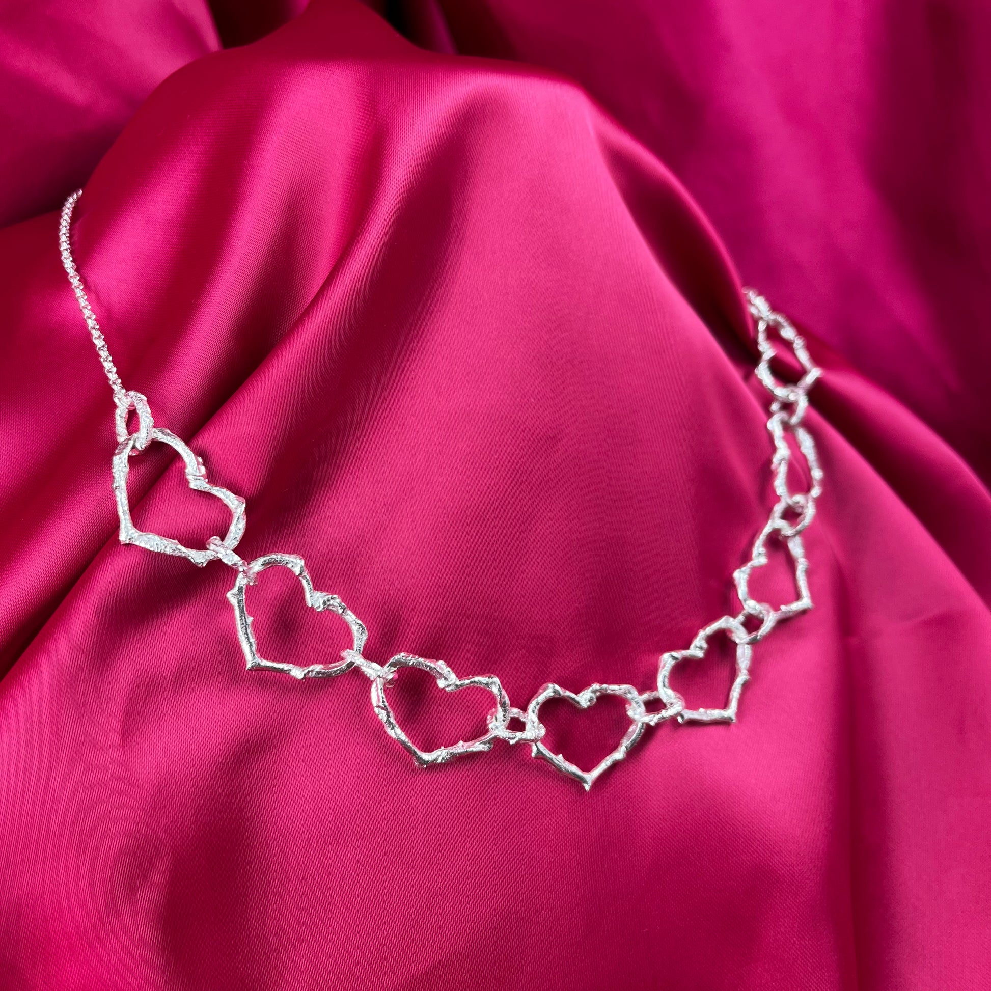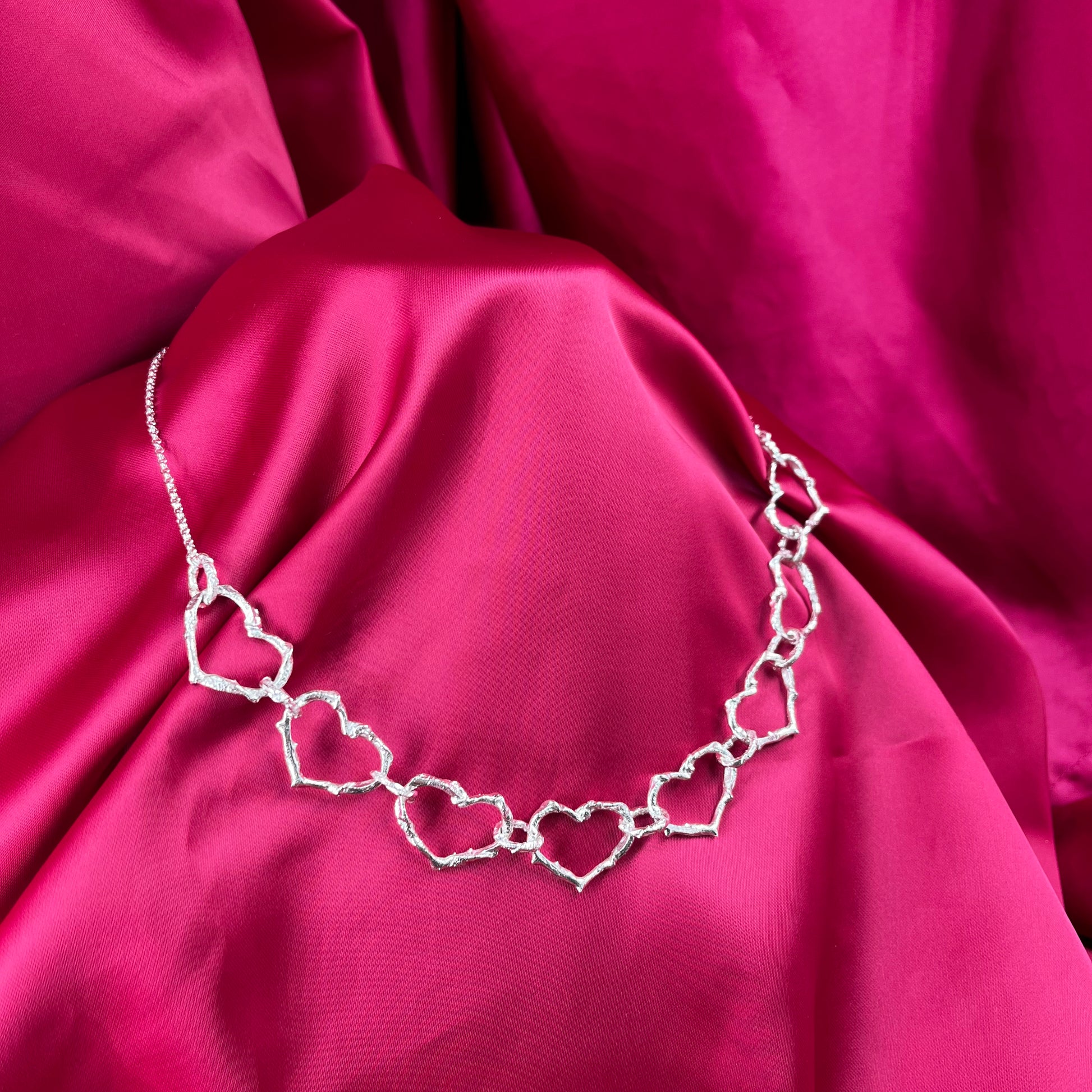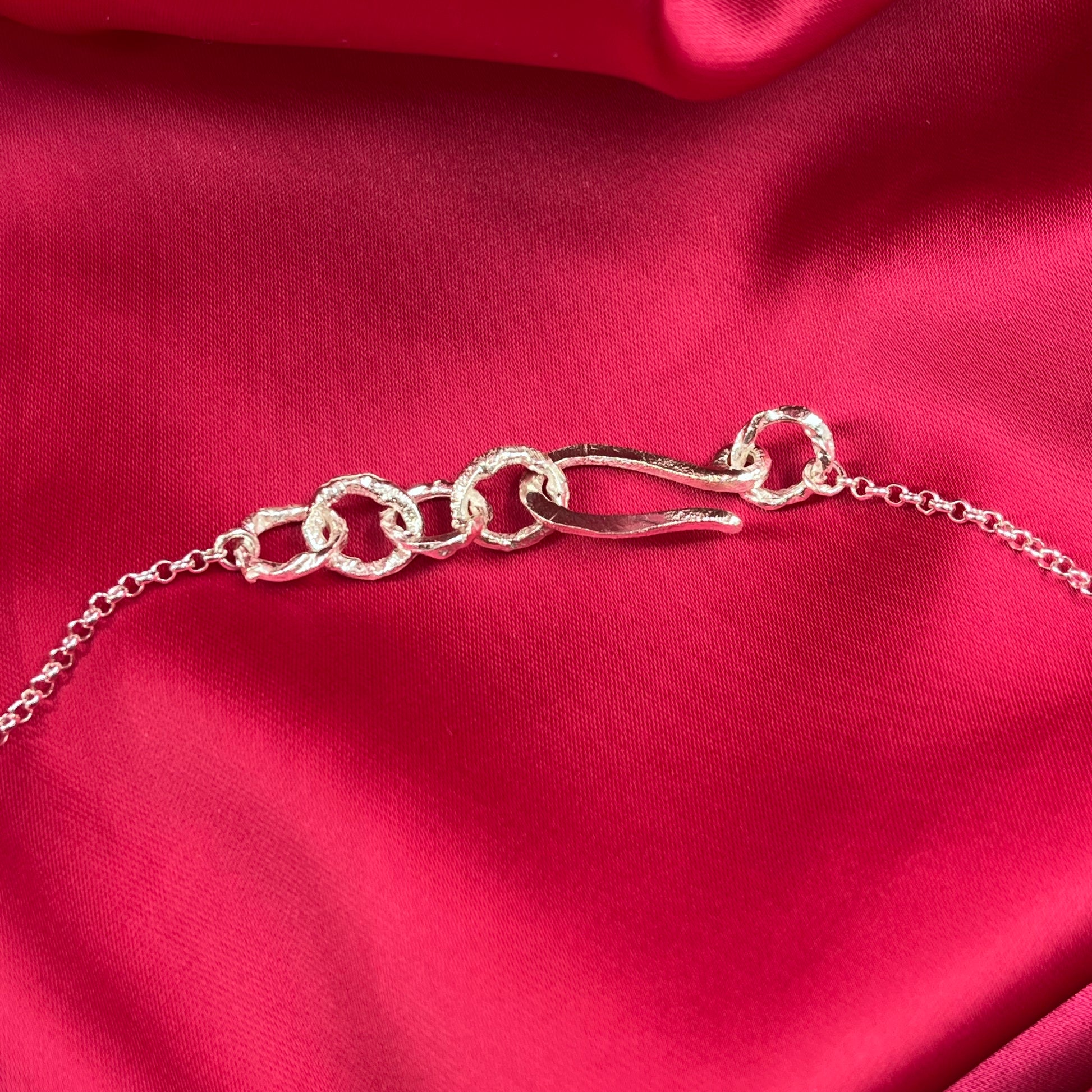 La cadena presenta 8 corazones en la parte frontal, que simbolizan amor y conexión. Luego, se une a una cadena rolo (eslabones redondos) que le da un toque elegante y delicado. El broche hecho a mano cuenta con un ajuste de 3 cm, permitiéndote personalizar la longitud de la cadena entre 43 cm y 46 cm, según prefieras.