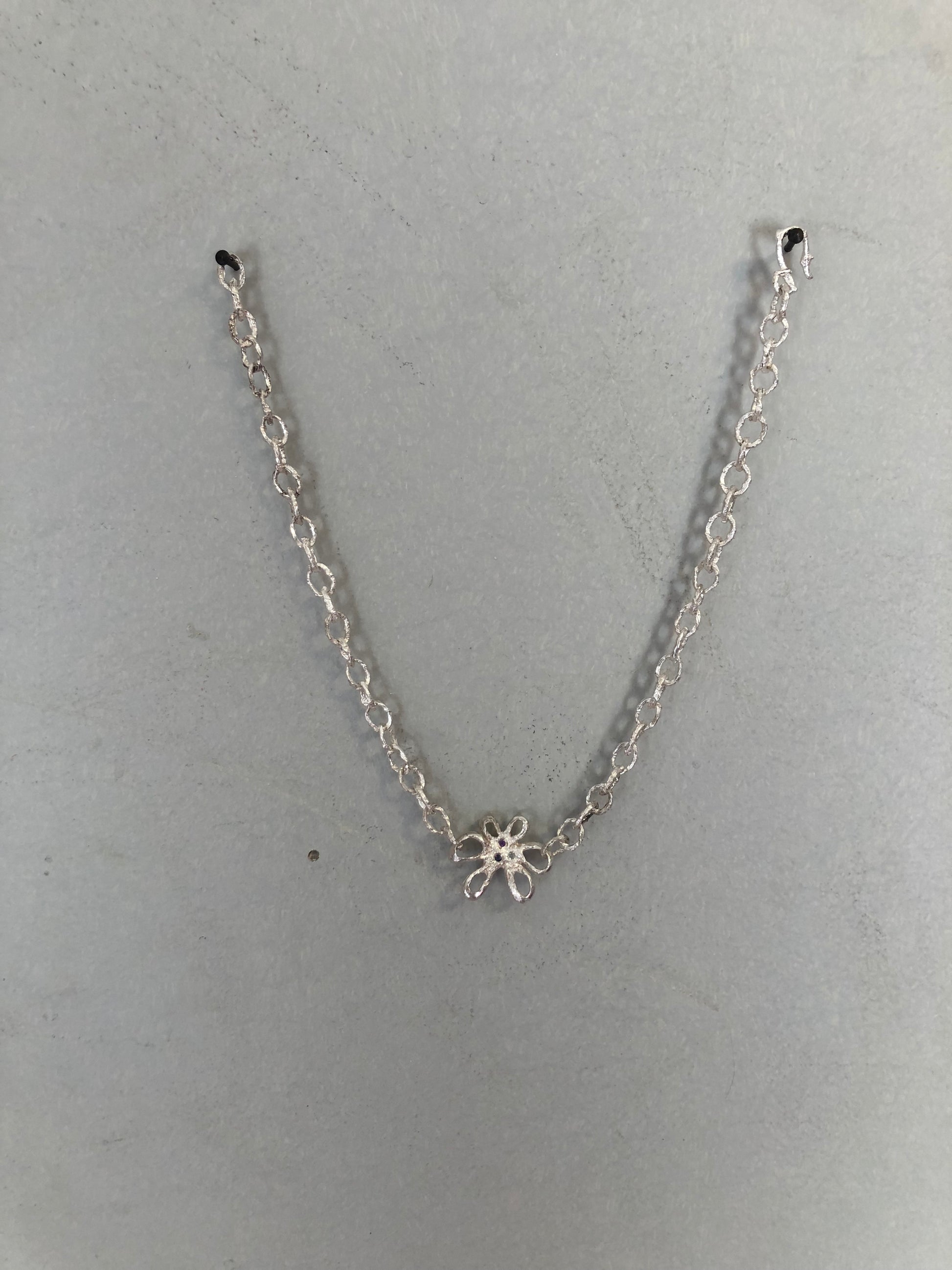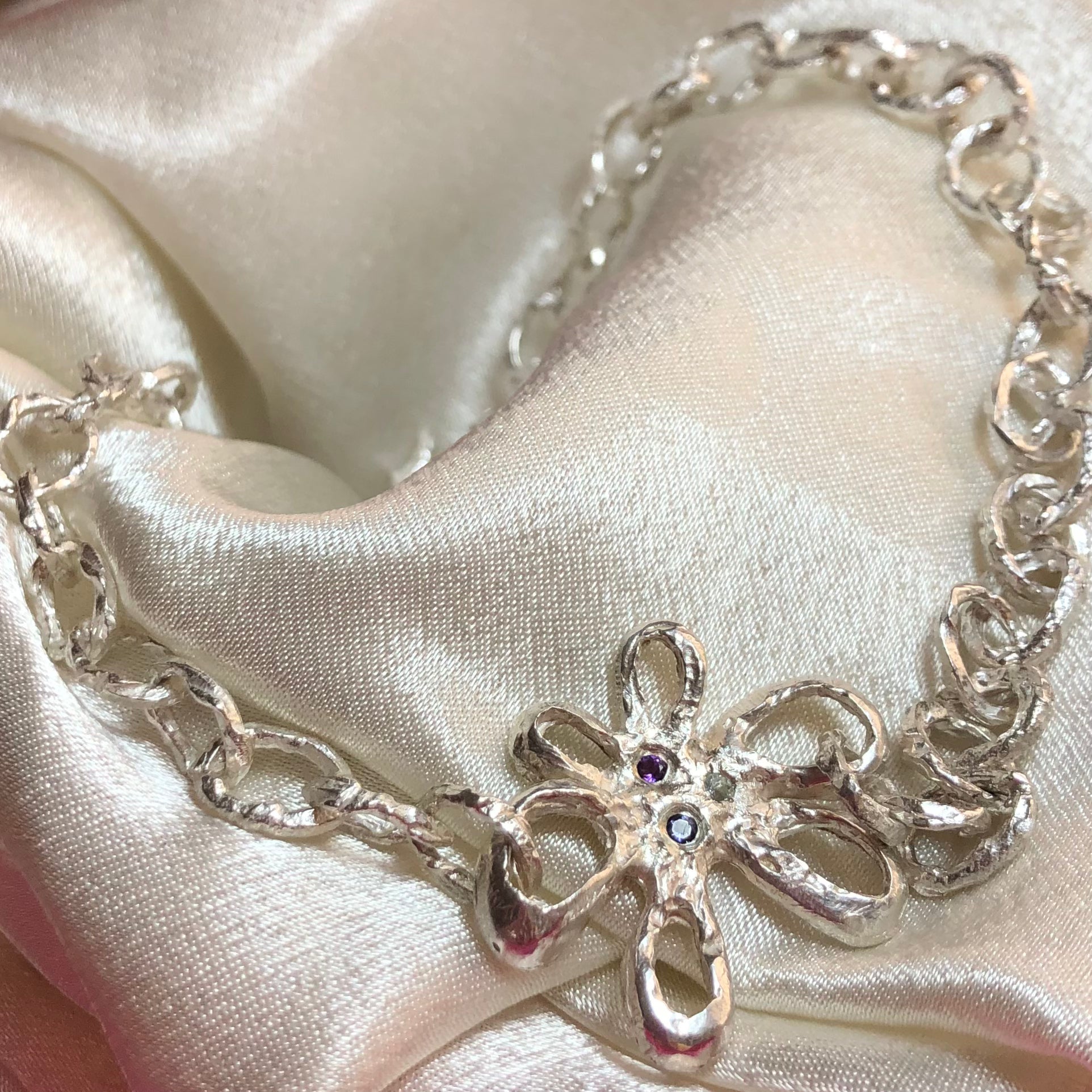 🔹 Diseño: Flor central con eslabones hechos a mano