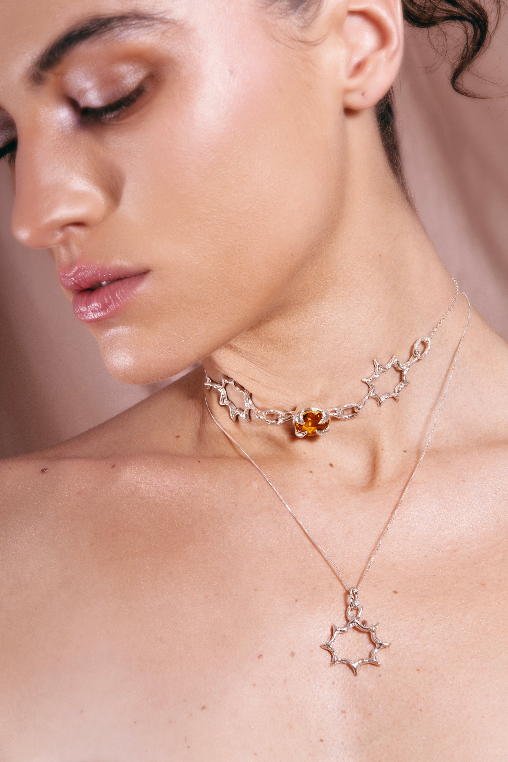 Este choker está protagonizado por un citrino redondo de 1,4 cm, engastado con 4 grifas que enmarcan su brillo cálido y solar. A cada lado, se une a un eslabón Estelthil, símbolo de equilibrio y regeneración, extendiendo su energía como un puente entre lo interior y lo sagrado.