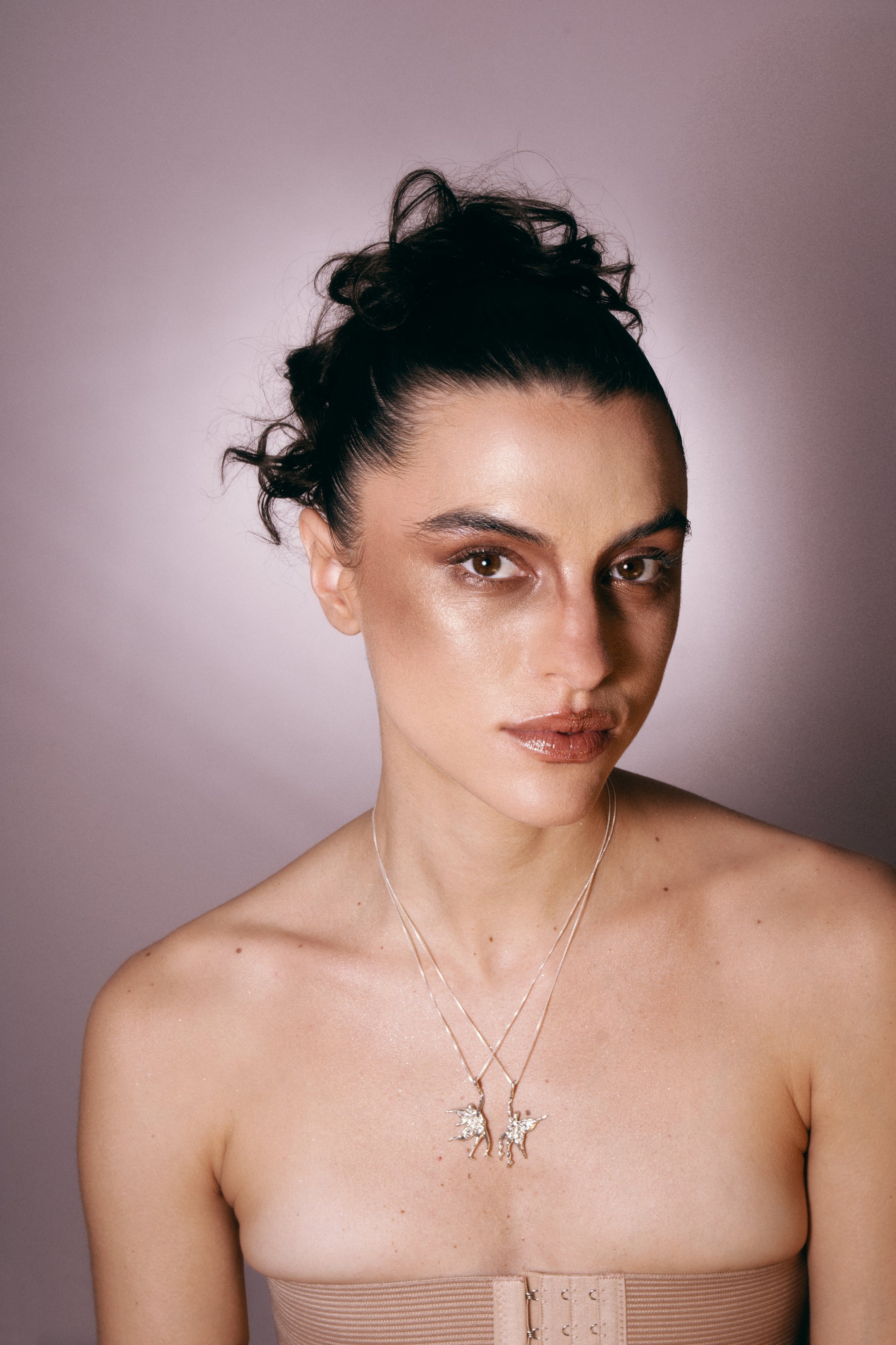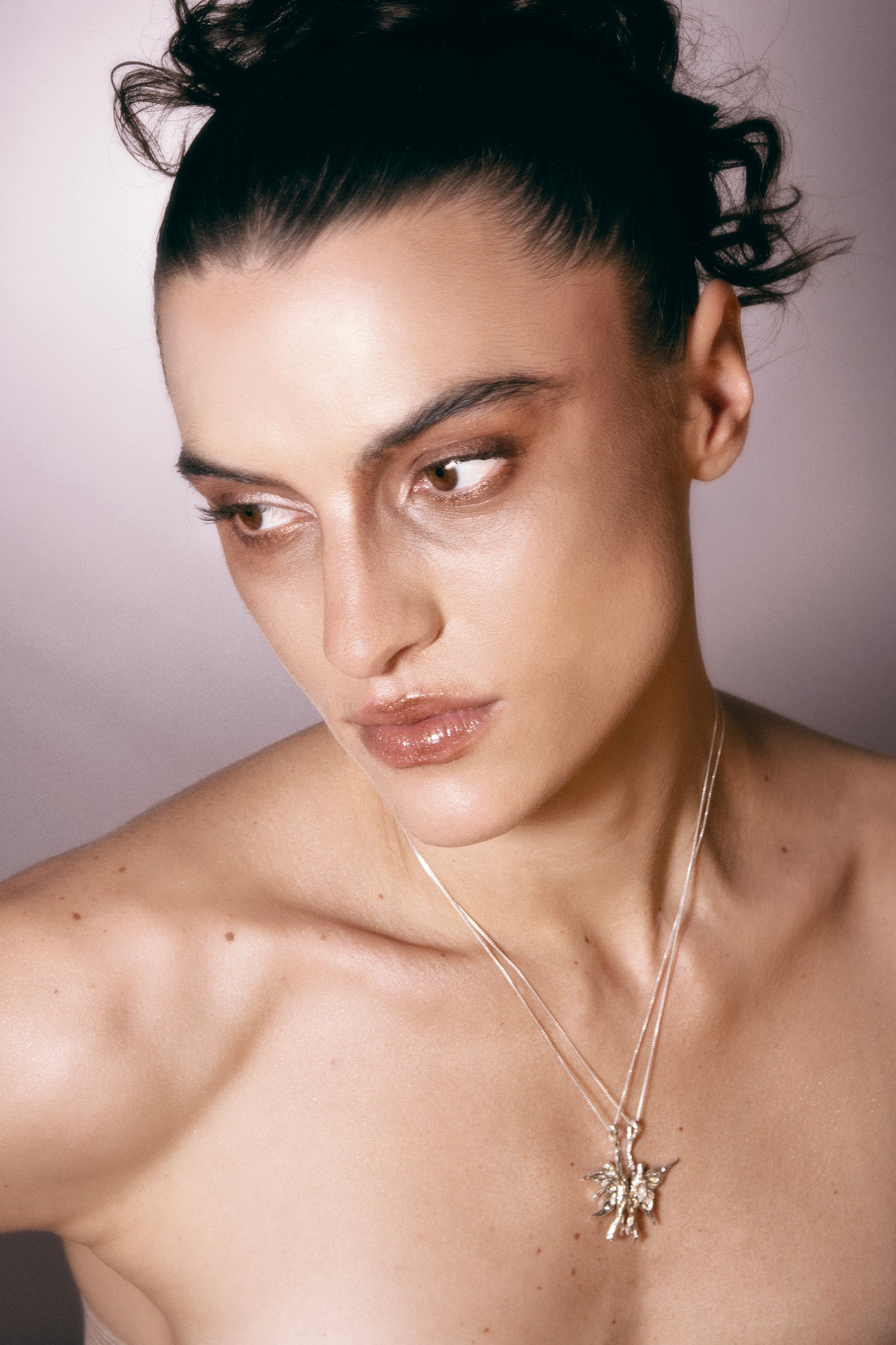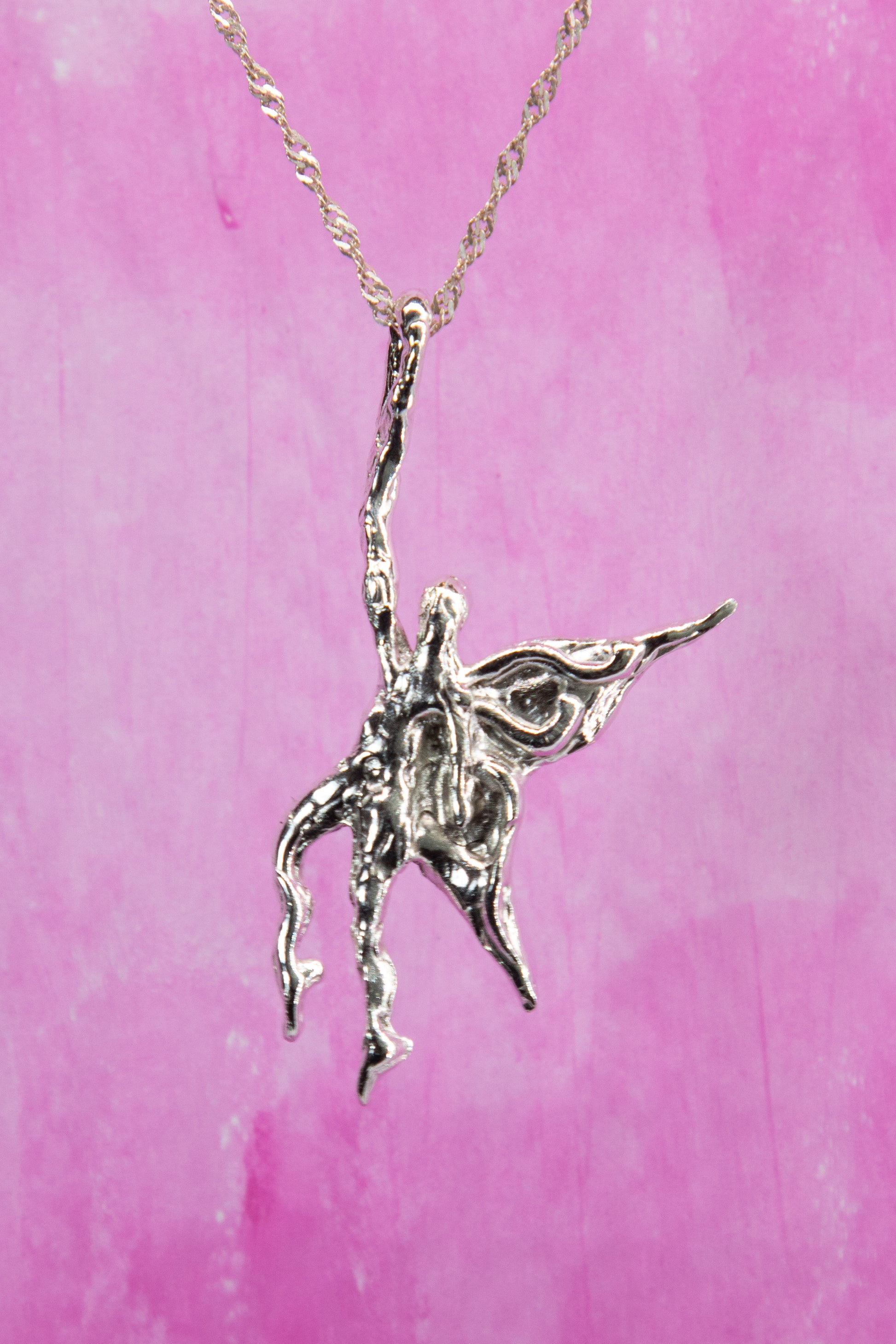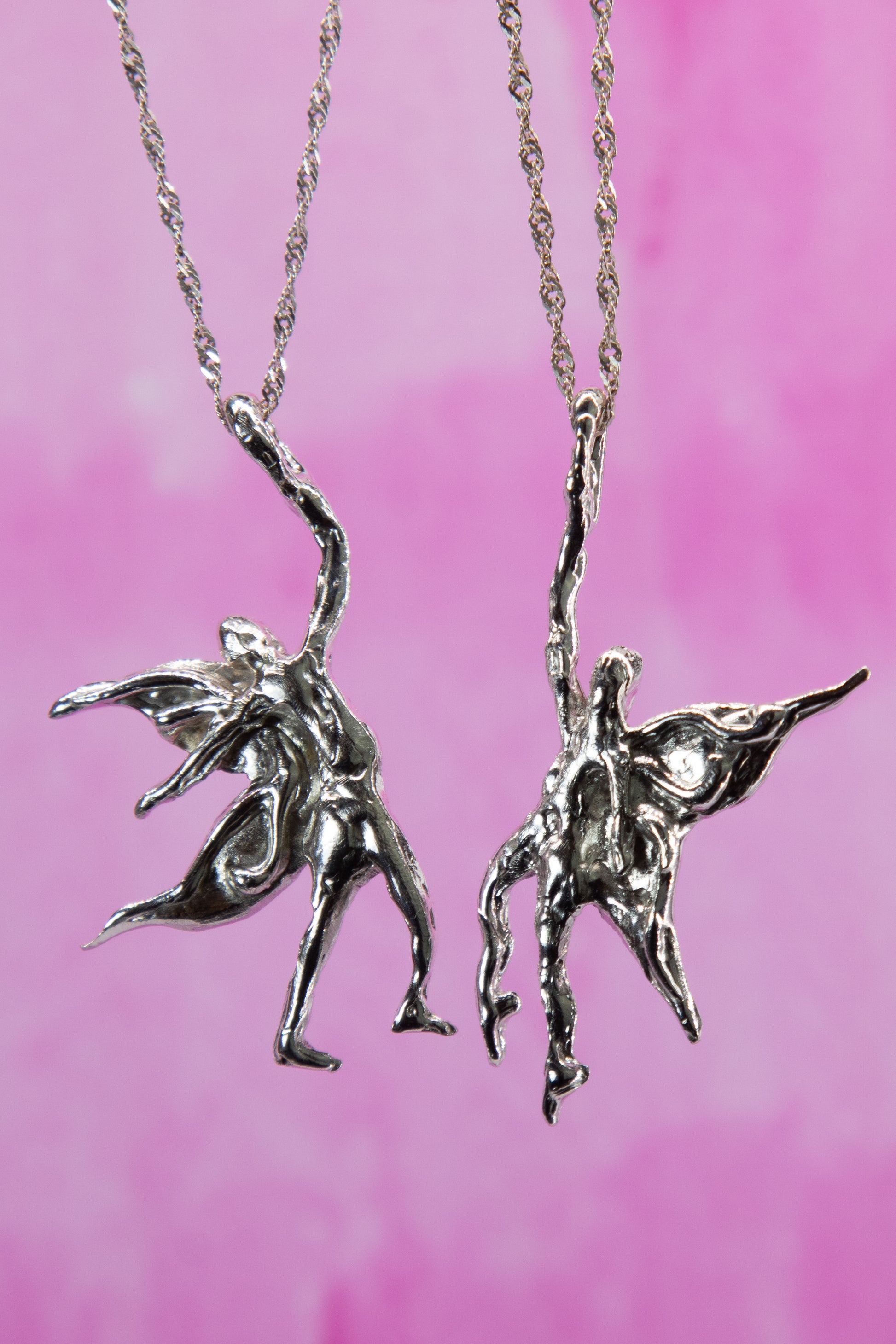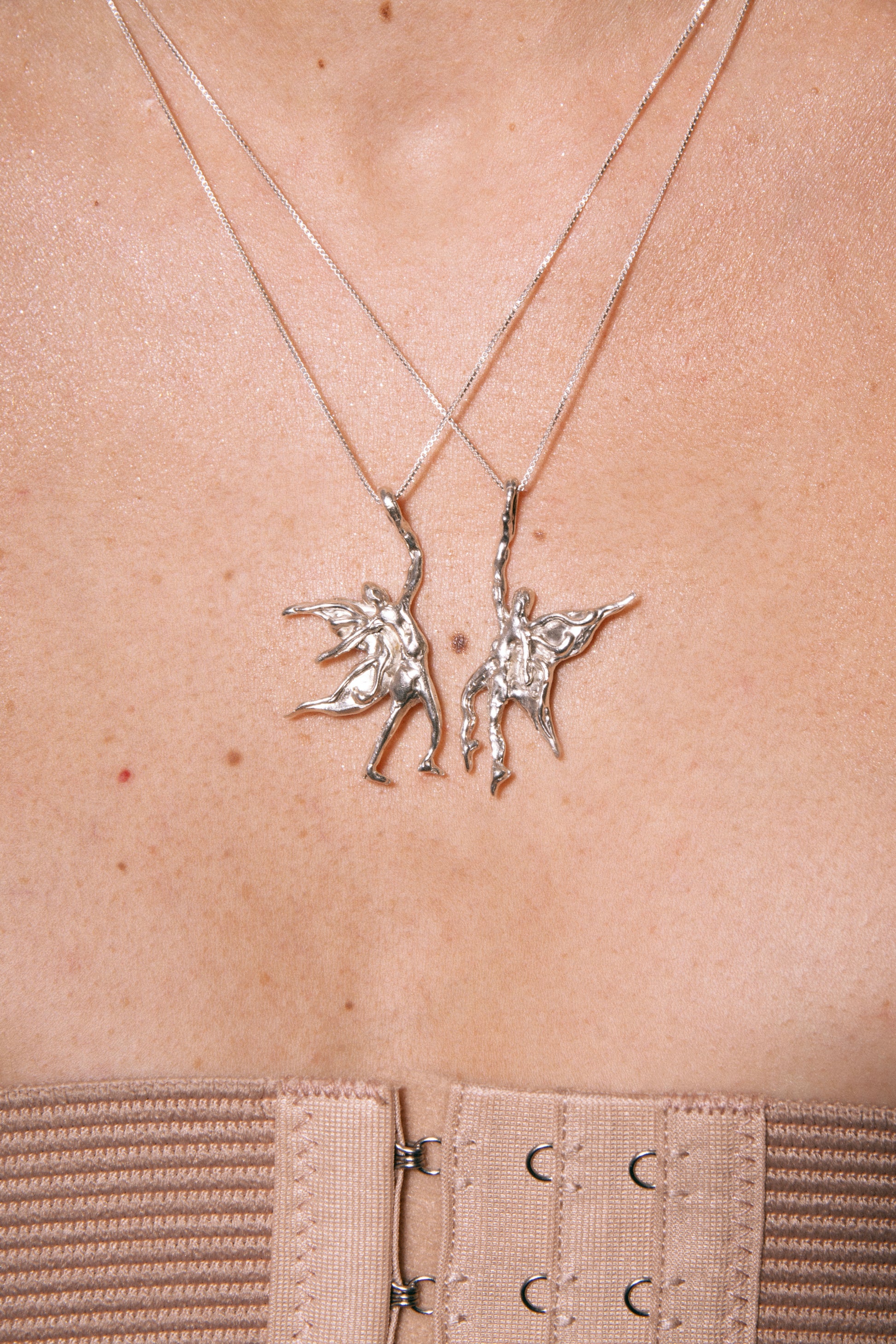 Dos seres alados que se encuentran en espejo. Cada uno es un colgante independiente, pero juntos componen una unidad. Son un símbolo del vínculo que nos sostiene: amor que no se limita a lo romántico, sino que también puede ser fraternal, amistoso o familiar.