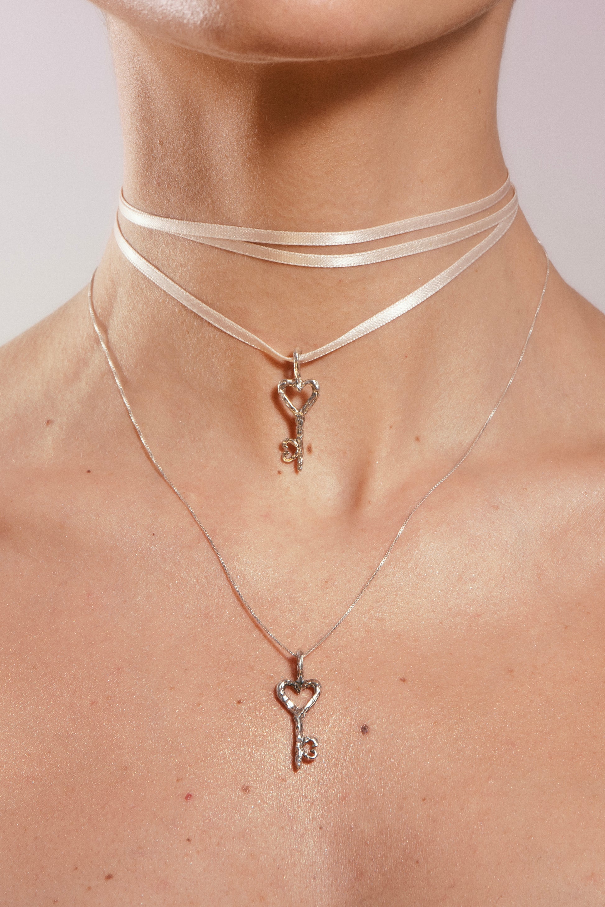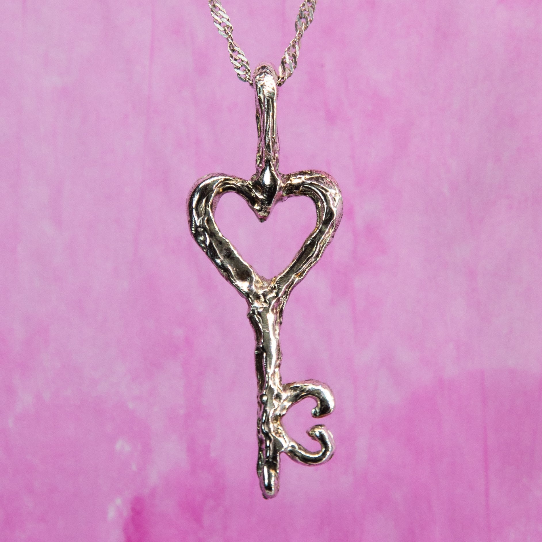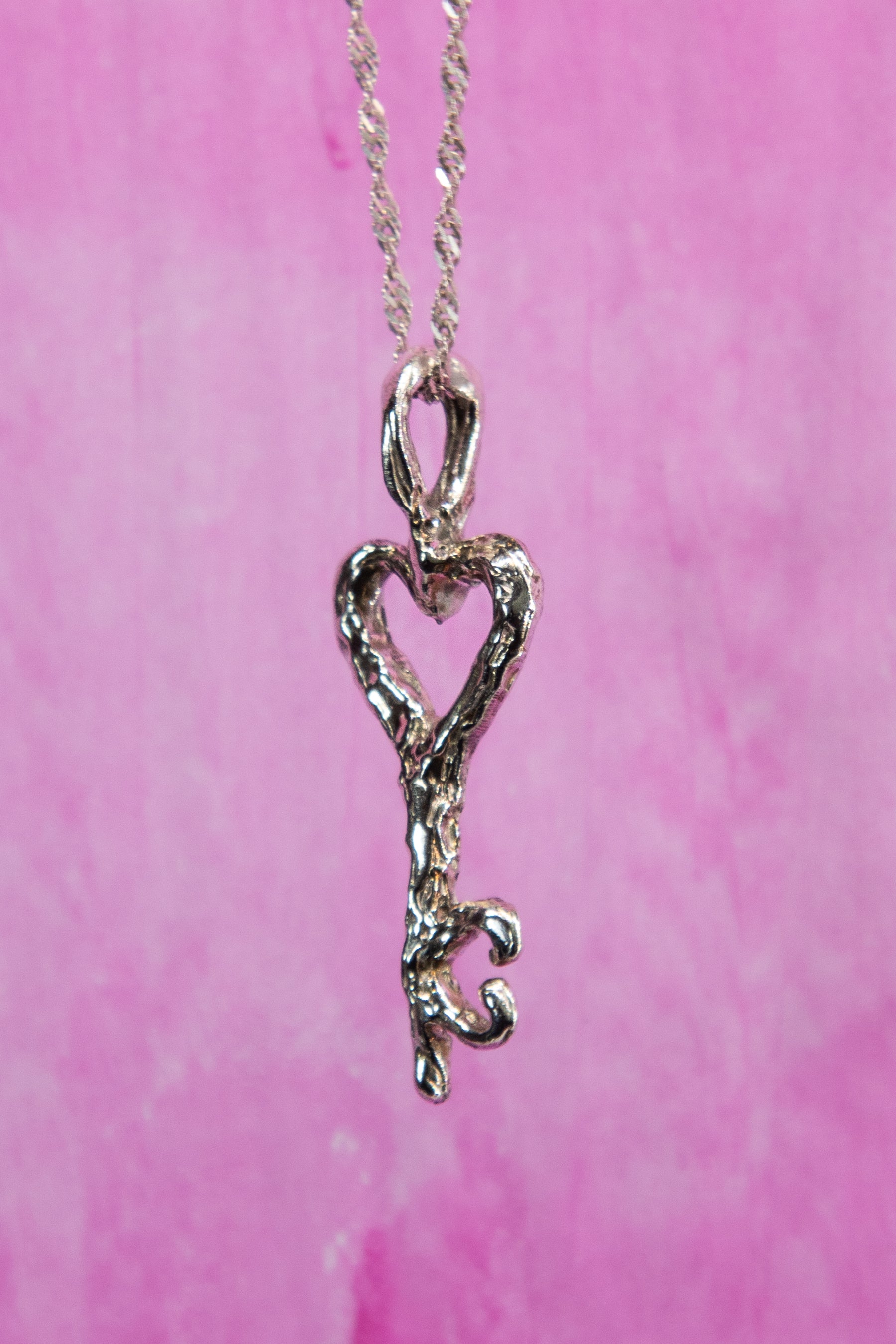 Este colgante representa la llave que abre el portal hacia una nueva forma de vivir, la llave de la vida. Tiene forma de corazón, y fue inspirada en la llave que las ninfas entregan a la protagonista de nuestro cuento: una llave que no borra el dolor, sino que le permite avanzar con él, llevándolo como parte de su historia, creciendo a través de sus raíces y abriendo su camino.