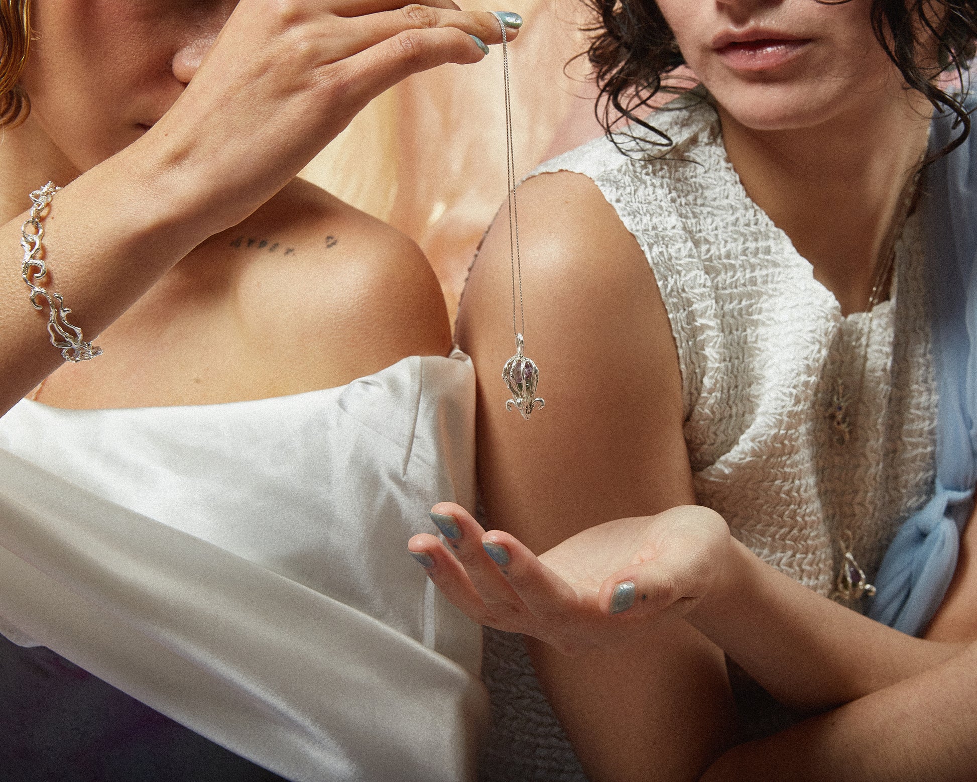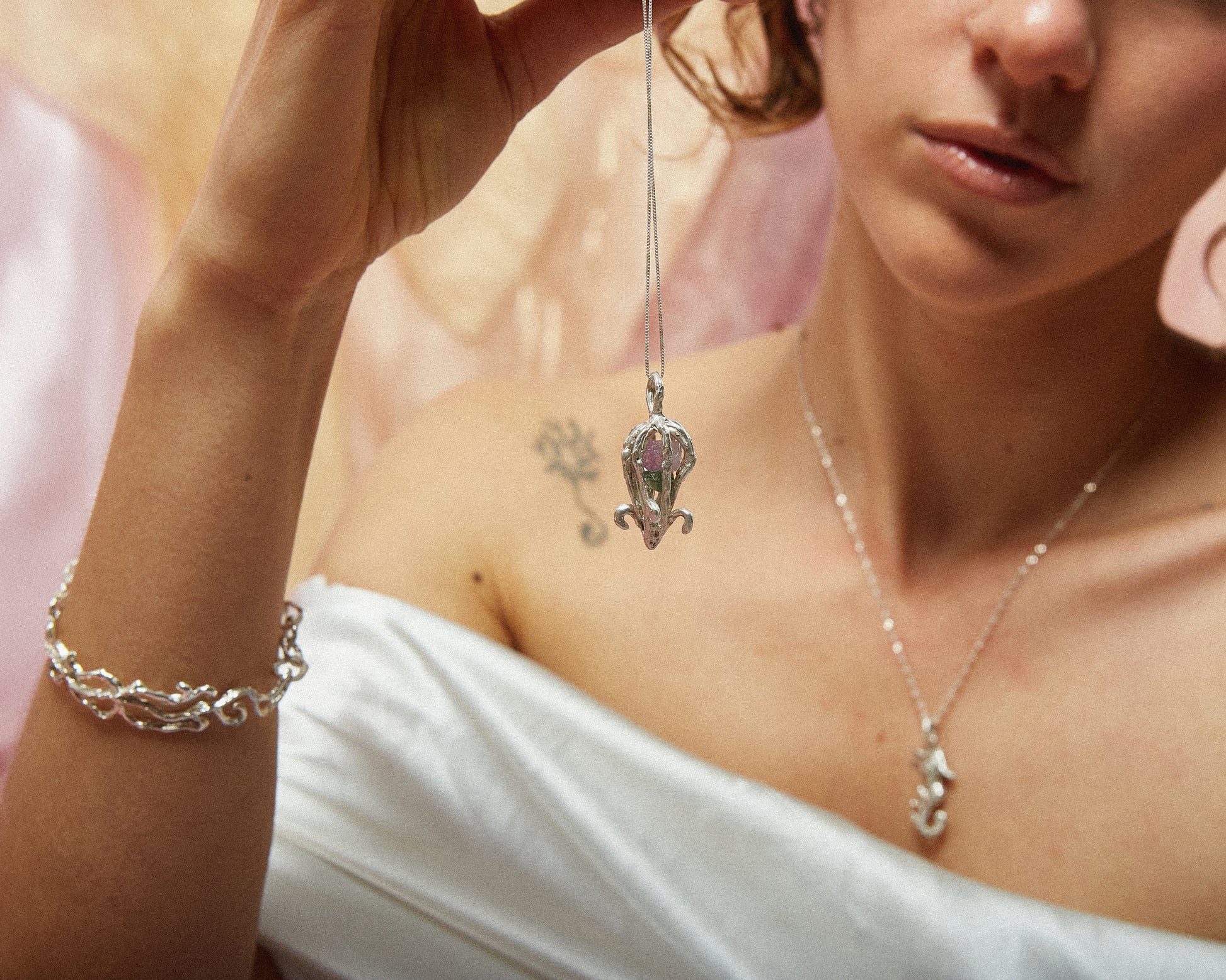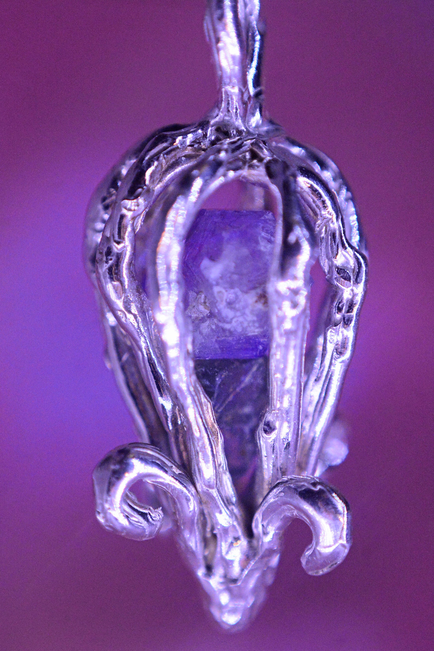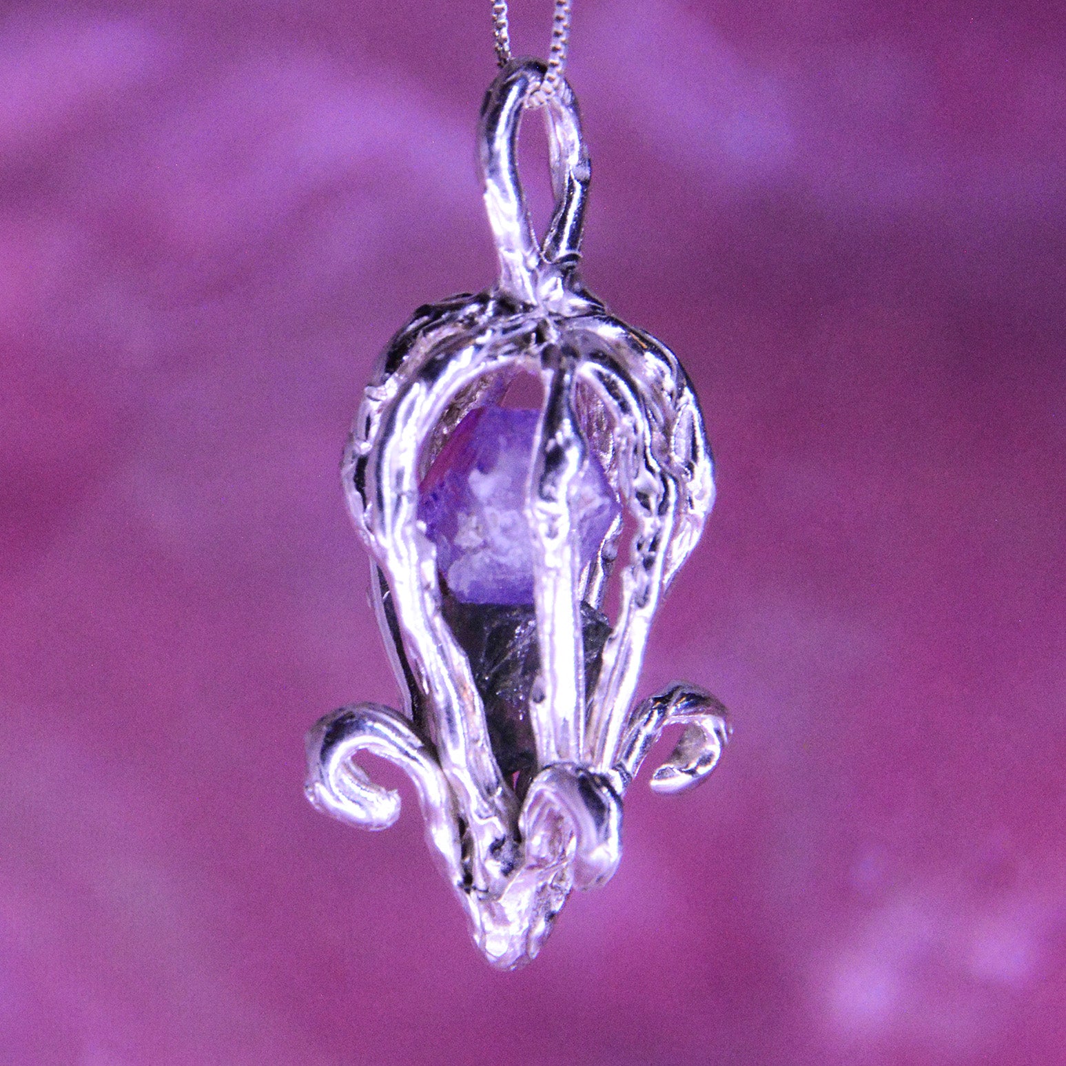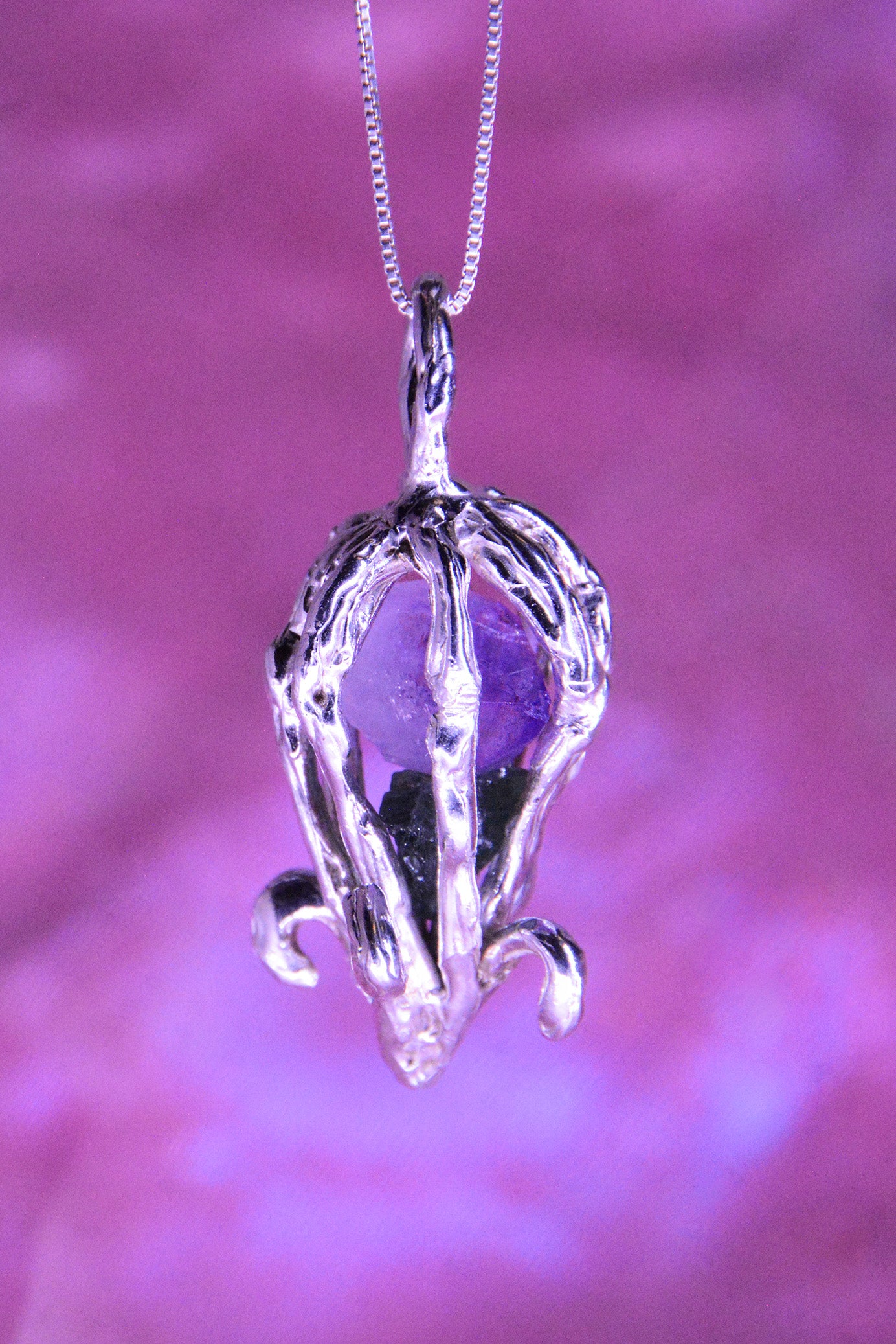 Un amuleto que guarda secretos y memorias del océano. En su interior, una amatista y una esmeralda en bruto descansan protegidas por la plata, resonando suavemente cuando se mueven, como un eco de las profundidades marinas.