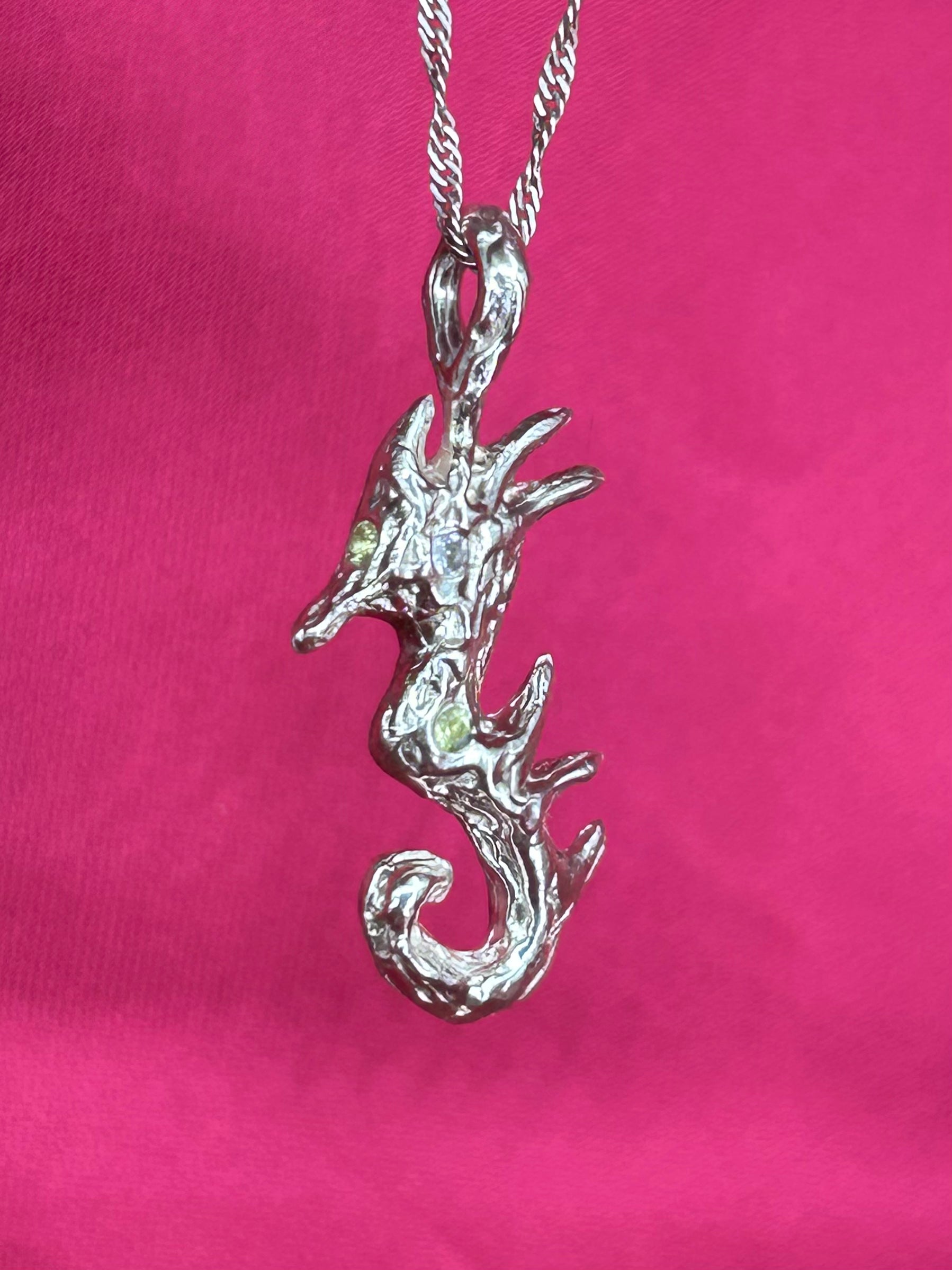 A diferencia del otro colgante Hypocampuz, esta versión tiene tres piedras estratégicamente ubicadas: una tanzanita en el ojo y dos peridotos, uno en el estómago y otro en la frente, evocando el tercer ojo.