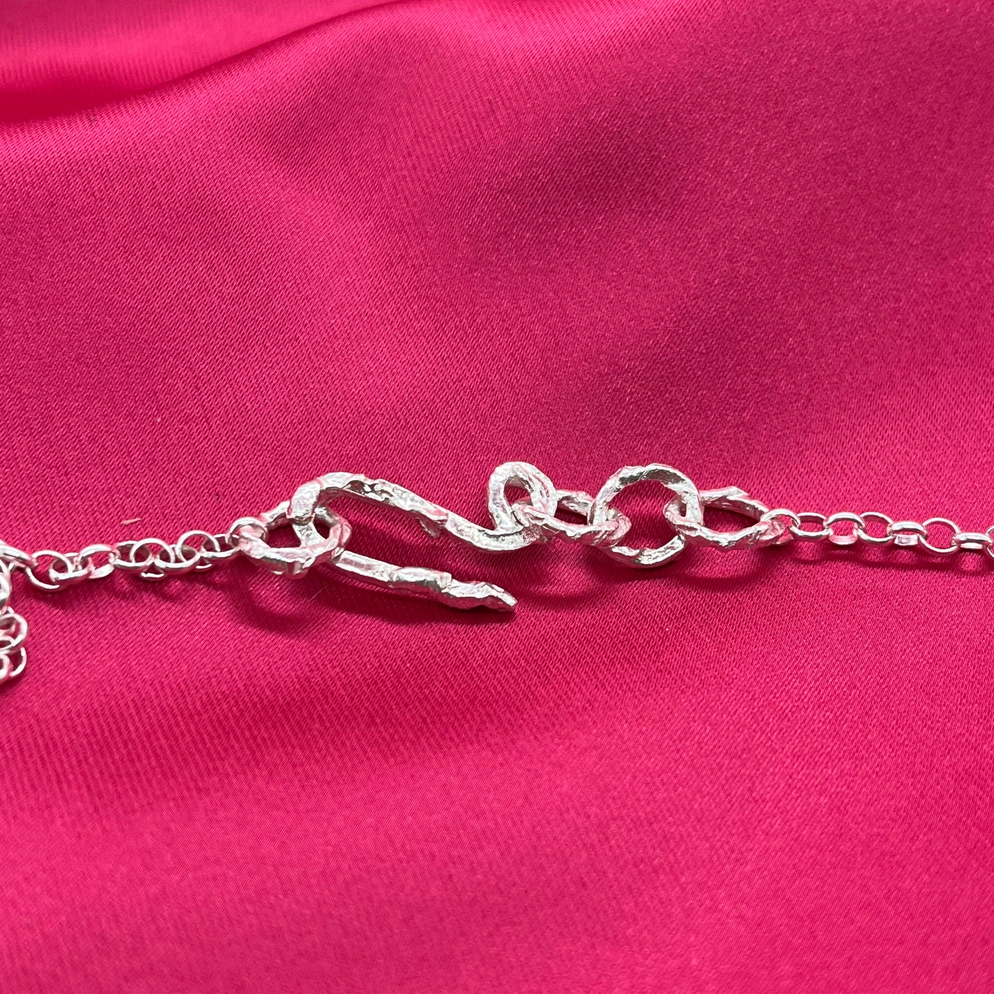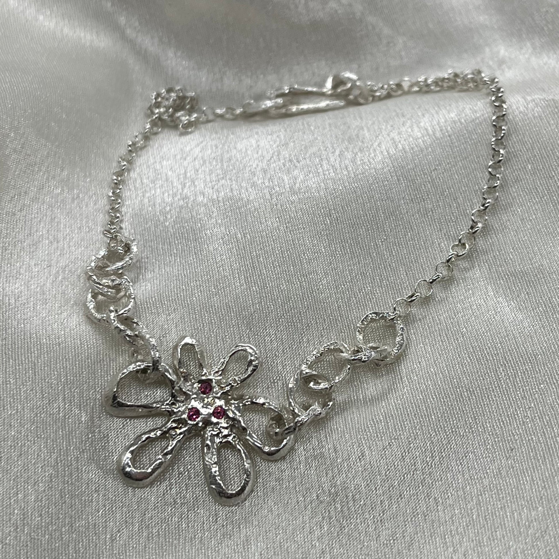 La Cadena Floralis Kiut es parte del mundo Floralis, siendo la versión intermedia dentro de la colección. Se compone de 7 eslabones hechos a mano a cada lado de la flor central, seguido por una cadena rolo de plata 925 y finalizada con un broche hecho a mano.