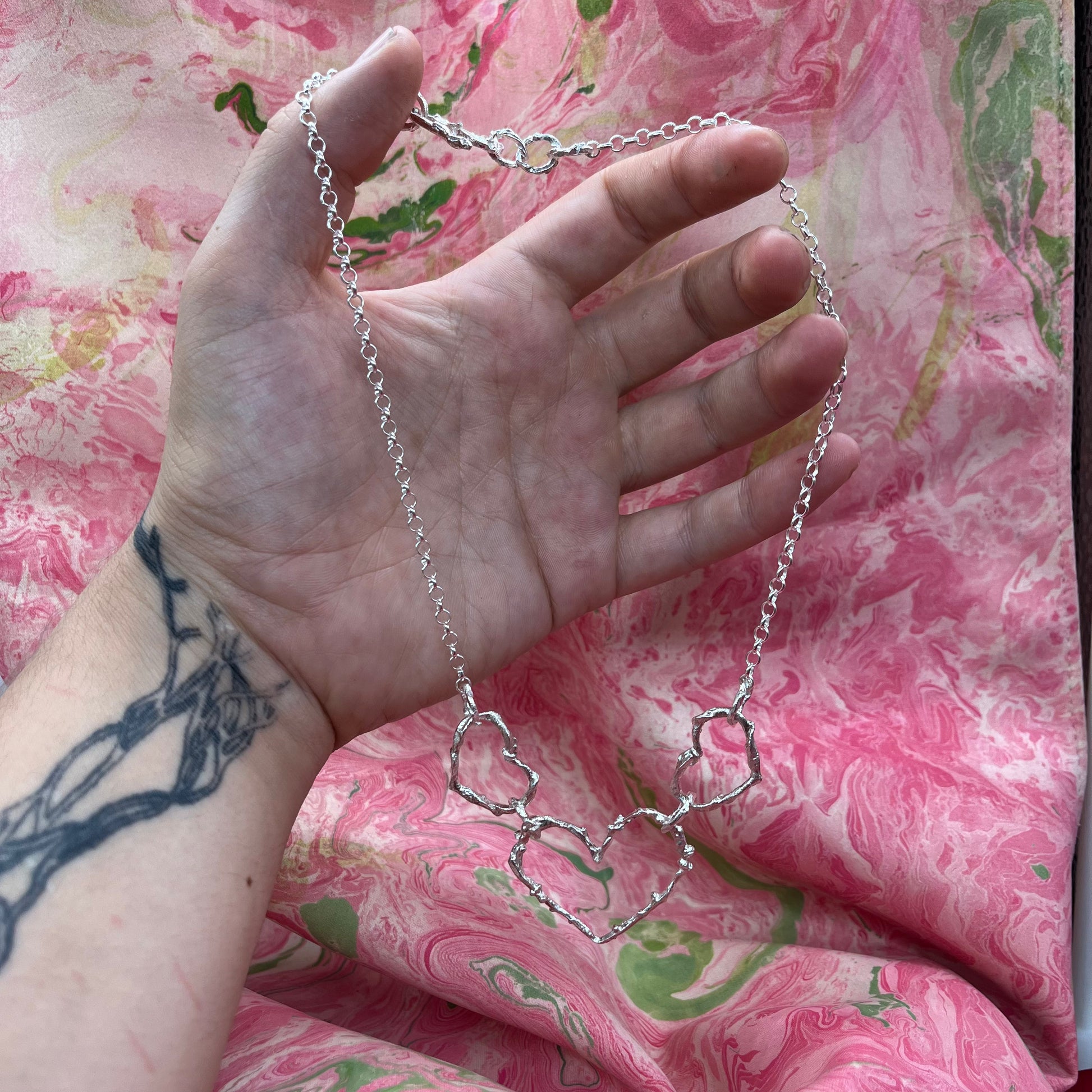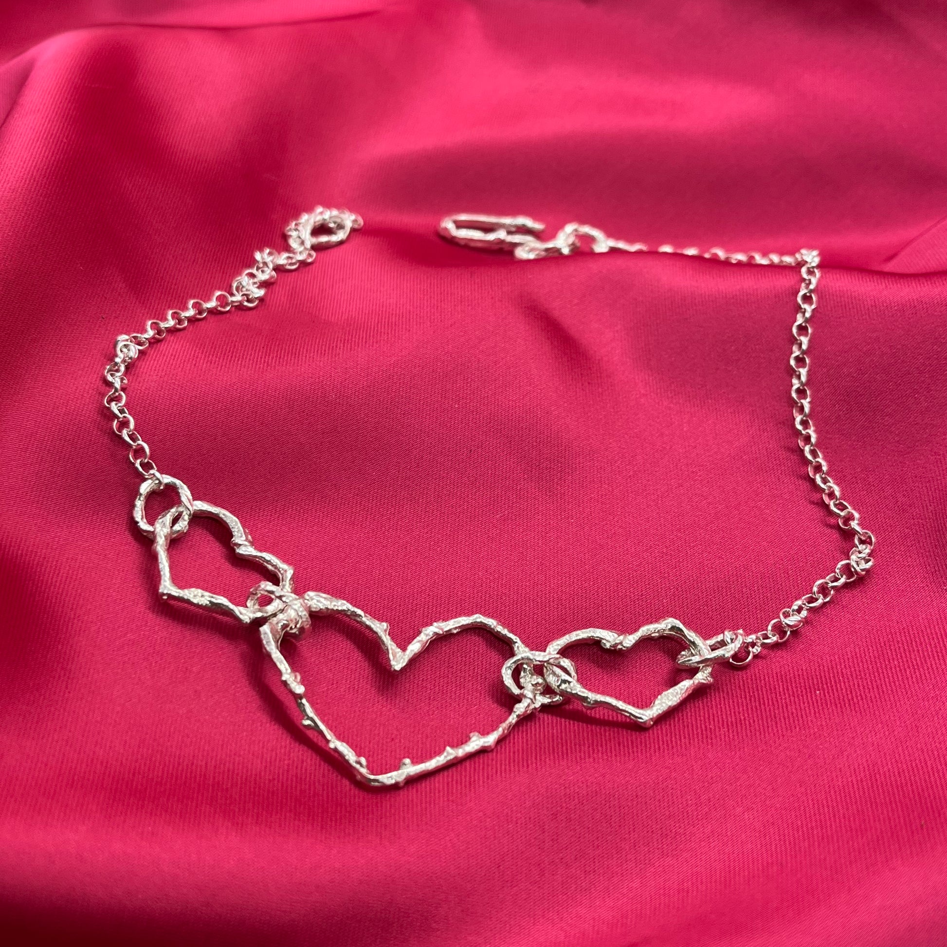 A continuación de los corazones, la gargantilla se continúa con un trozo de cadena rolo 925, agregando un detalle de elegancia y suavidad al diseño.