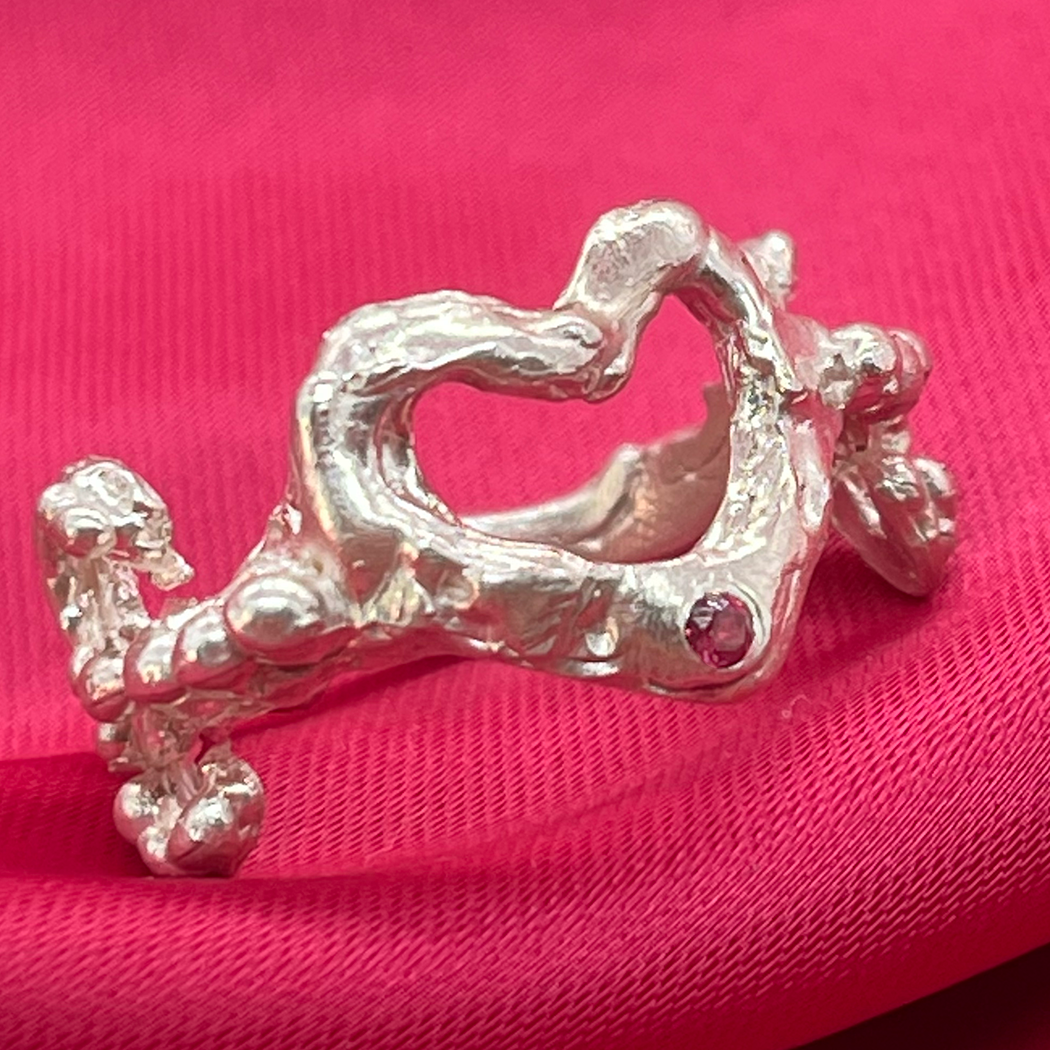Su diseño destaca por un corazón central, acompañado de una piedra facetada de 2 mm en su parte inferior. En los costados, delicados ornamentos y pequeñas esferas envuelven el anillo, dándole un toque especial y único.
